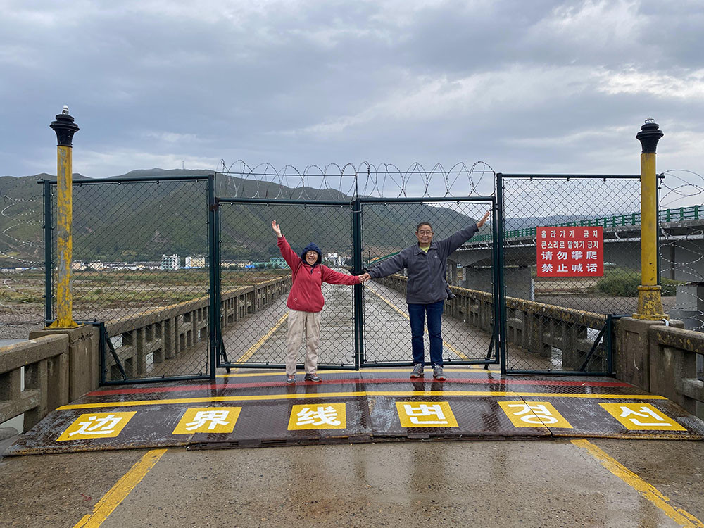 不远处就是国门景区,建于1941年的图们江公路大桥已经废弃,对应的老国门也已经关闭;一侧新建的大桥已经落成,高大的新海关更加庄严。沿着公路桥走到中间,一道铁丝网拦住了去路,桥面上用中朝两种文字书写着“边界线”三个字,站到边境线上,来一张到此一游。