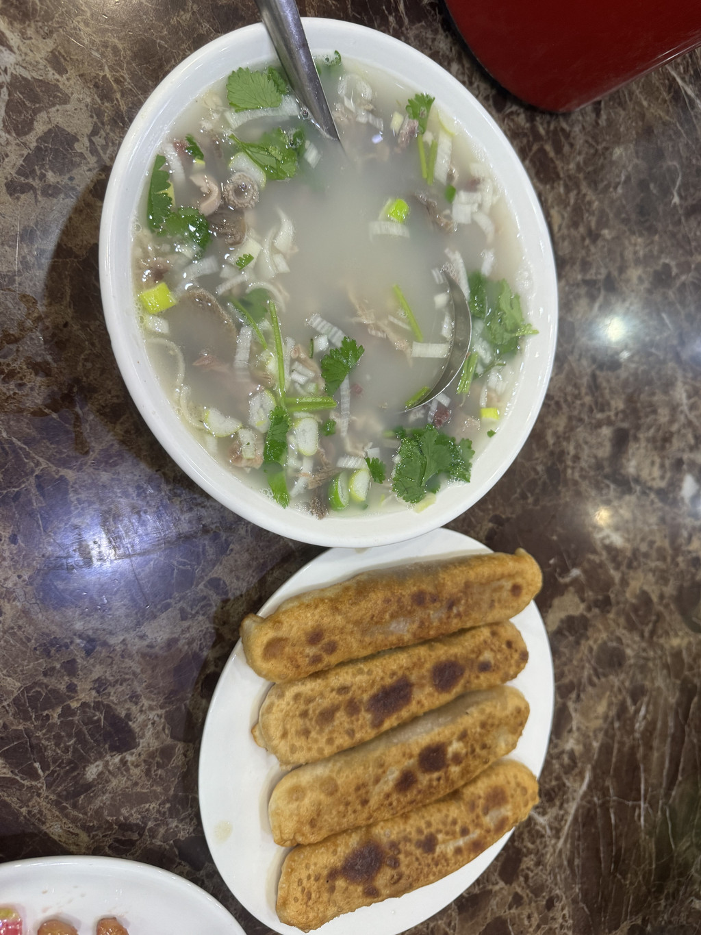 这里有各种清真熟食、爆肚、烧麦、烧烤、还有新鲜斩杀的牛羊肉……清真美食街里面多为风味小馆子,大部分都继承西域美食特点。我们品尝了西关最绝的小吃''回头'',色泽金黄,皮焦馅嫩,口味鲜香。回头属于清真食品,精选牛肉馅,用筋性很大的面擀皮包成长方形,再入锅煎至两面金黄。外焦里嫩,一个回头吃下去,绝对满足你的味蕾,汁水多。韭菜爆炒羊肝也很美味,很久没有尝到这么香韭菜了。