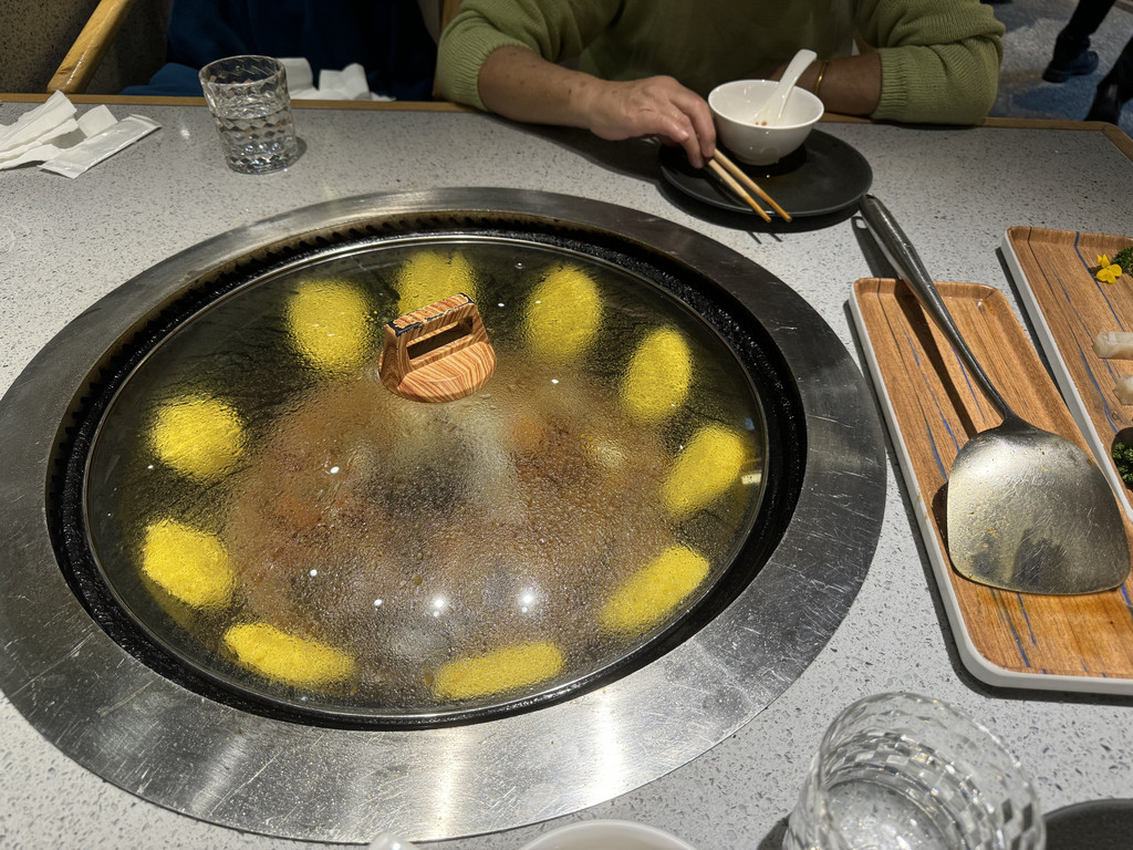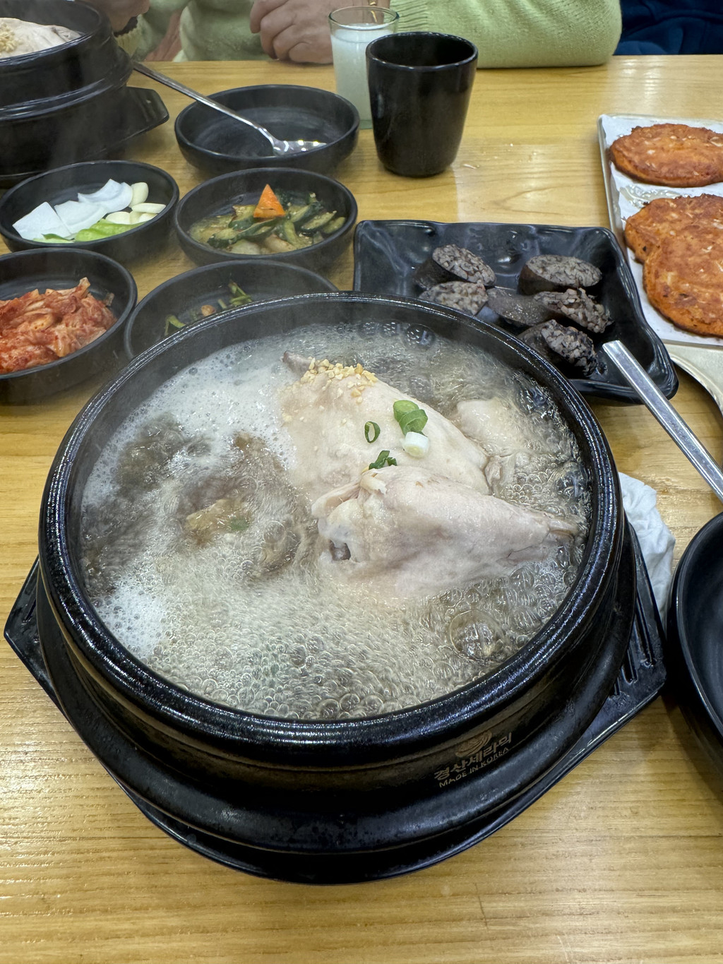我们在丹东的2顿晚餐都是在高丽街吃的。一顿吃辣螃蟹、打糕、石锅汤饭,还有丹东著名的黄蚬子味道鲜美。另外一顿是参鸡汤。20多年前我去韩国旅游吃过,念念不忘。不仅不油腻,且清爽鲜美,带有一股药香。鸡肉炖得极烂,筷子一夹之下骨肉分离,肉香中还带有米香、药香。鸡肚里面填着满满的糯米,汲取鸡汤精华的糯米比嫩鸡肉更要美味。同时鸡肚里面还有大枣、板栗、枸杞、高丽参等配料营养丰富。