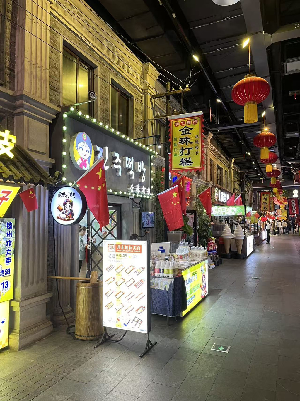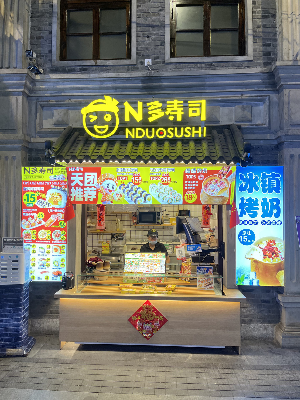 当暮色为鸭绿江镀上金边,安东老街便成了流动的盛宴。青石板路两侧,灯笼次第亮起,将"金珠打糕"的黑底白字招牌映得发亮,卡通装饰在光晕里眨着眼睛,与隔壁"N多寿司"的黄底笑脸图案隔街相望——这条老街像一本摊开的立体菜单,每一页都写满了丹东人舌尖上的乡愁与新潮。一、金珠打糕:糯米与糖浆的古老情书走近"金珠打糕"的铺面,甜香先于视觉抵达。店铺门口插着的国旗在晚风里轻轻翻卷,与头顶的红色灯笼一起,为这方小天地添了热闹的底色。展示牌上,彩色手绘的打糕图案憨态可掬——原味的纯净如初雪,宫廷口味的裹着细腻红豆沙,糖浆冰的淋着琥珀色光泽,仿佛在诉说这门传承百年的手艺如何与时俱进。案板前,师傅正将蒸熟的糯米反复捶打。木槌起落间,糯米渐渐变得黏糯筋道,像被注入了生命力。"要打够三百下才够Q弹",师傅笑着解释,额角还沾着几点米粉。刚出锅的打糕被分成小块,裹上黄豆粉、花生碎或是蜜红豆,咬下去时外层的糖浆会拉出细丝,内里的糯米却韧而不粘,甜香在齿间层层绽放。旁边摊位上的冰淇淋模型与瓶装饮品,倒像是给这份传统甜品配上了现代小调,让老味道有了新喝法。二、N多寿司:江畔的新派滋味转过街角,"N多寿司"的黄底招牌像一抹阳光,点亮了老街的烟火气。笑脸卡通图案旁的价格牌上,"招牌海苔寿司15元"的字样格外醒目,冰镇烤奶"原价15元/杯"的标签在灯光下闪烁。展示柜里的寿司模型精致可爱,三文鱼片泛着橙红光泽,米饭粒粒饱满如珍珠,仿佛下一秒就会从玻璃柜里"跳"到食客盘中。这家开在老街的寿司店,像一位穿着传统服饰的年轻人——灰砖墙背景保留着老街的质朴,柜台里却摆着当下流行的海鲜寿司组合。店员麻利地捏着饭团,海苔的咸香与米饭的清甜在指尖交融,再点缀上新鲜的蟹柳或芒果,传统与现代的味道在这里碰撞出奇妙的火花。背景里飘来的打糕甜香与寿司米的清香交织,恰似鸭绿江的水,既滋养着古老的渔猎文化,也接纳着奔涌而来的新潮。三、长街味语:舌尖上的时光叠影老街的美食从不拘泥于单一的标签。金珠打糕的糯米香里,藏着朝鲜族先民对谷物的虔诚;N多寿司的海苔鲜里,映着丹东作为边境城市的开放胸襟。街角或许还飘着烤冷面的焦香,远处隐约传来焖子的蒜蓉气息,每一道小吃都是丹东人生活的注脚——它们既可以是深夜加班后的慰藉,也可以是游客打卡时的惊喜,更是老街坊们围坐闲聊时,那碟必不可少的"下酒菜"。灯笼的光晕漫过青石板,将店铺招牌的影子拉得很长。金珠打糕的黑色底牌与N多寿司的黄色招牌在光影里交叠,像一首用味觉写就的叙事诗:古老的打糕技艺是诗里的平仄韵律,新派的寿司创意是跳跃的灵动意象,而穿行其间的食客们,则是这首诗最生动的标点符号。