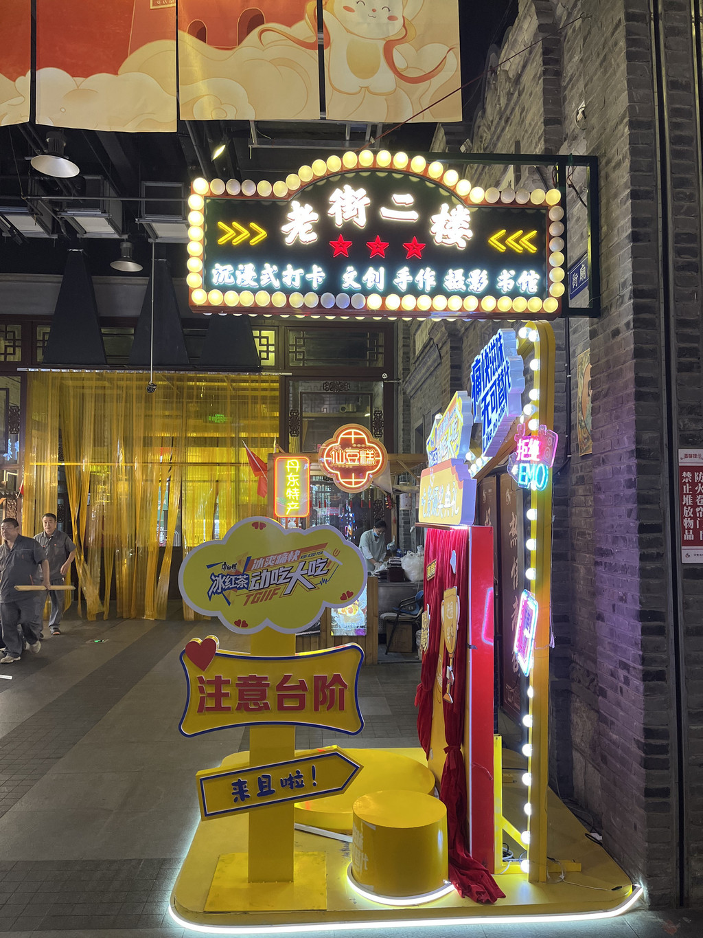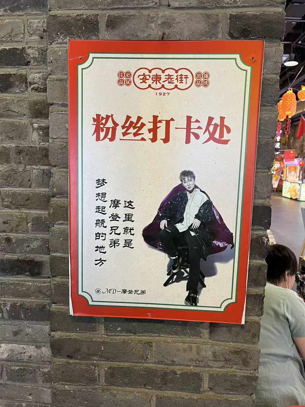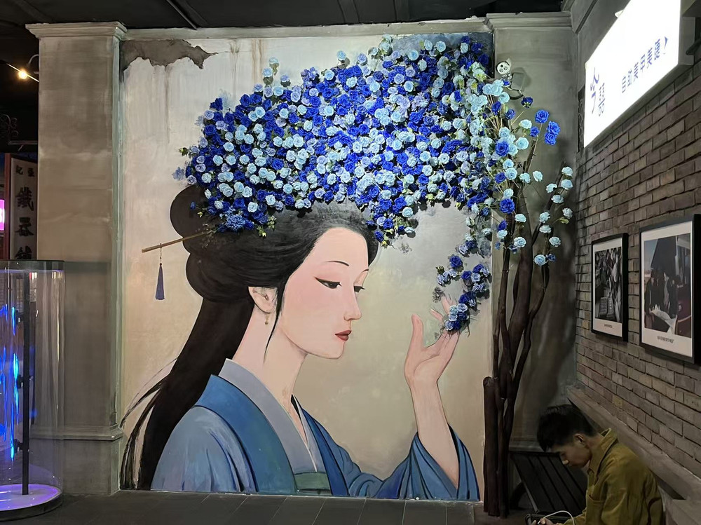 在安东老街的青石板路上漫步,不经意间就会与历史撞个满怀。这条街的每一处转角都藏着时光的密语,那些精心布置的打卡地,就像散落在旧时光里的珍珠,串联起过去与现在的浪漫对话。一、"今瑟"壁画:花影中的古典绮梦转过一条幽深的巷弄,一面泛黄的墙面上,一幅壁画如诗如画地绽放。画面中央,一位身着蓝色传统服饰的女子侧头闭目,仿佛正沉浸在一场与花神的私语中。她长发盘起,发髻上簪着几朵蓝花,右手轻拈一朵蓝色小花,指尖与花瓣的触碰仿佛能听见细微的"簌簌"声。女子神情温婉,眉眼间流转着古典的诗意,仿佛从千年前的仕女图中款款走来。她头顶上方,簇拥着大量蓝色和浅蓝色的花朵,花团锦簇,如同一片被凝固的春日花海。这些花朵以细腻的笔触勾勒,层层叠叠,既有工笔的精致,又有写意的洒脱,与女子身上的蓝衣形成和谐的共鸣。壁画右侧,一棵装饰树点缀着同样的蓝色花朵,枝桠伸展,与主体女子的花冠遥相呼应,仿佛在诉说着一场跨越时空的花语对话。背景是泛黄的墙面,岁月斑驳的痕迹清晰可见,却意外地营造出一种复古的氛围。灰砖墙上挂着几幅黑白照片,照片里或许曾记录着老街的旧日繁华,如今与壁画相映成趣,为这幅现代创作增添了历史的厚重感。右下角,一位身着黄色衣服的人正低头专注于手中的事物,或许是正在描绘这美好瞬间的画师,又或许只是被这壁画吸引的游客,他的存在让整个画面从静态的画中活了过来,充满了生活的温度。这幅名为"今瑟"的壁画,不仅仅是一处打卡地,更像是一首用色彩与线条谱写的古典诗篇。蓝色调的运用如同一条情感的纽带,将观者带入一个宁静致远的意境,让人忍不住驻足凝望,与画中女子一同轻嗅那朵蓝色小花的芬芳,感受那份穿越时空的诗意与浪漫。二、"1927粉丝打卡处":摩登与怀旧的交响沿着老街继续前行,一面石墙上张贴的海报瞬间抓住了人们的目光。海报顶部红底区域赫然写着"安东老街 1927",下方以较大红色字体标注着"粉丝打卡处",醒目而热烈。中间是一位穿着时尚的男士形象,他披着紫色披风,坐在椅子上,姿态潇洒不羁,仿佛是从旧时光中走出的摩登偶像。海报左侧,竖排文字"这里就是 摩登兄弟 梦想起航的地方"诉说着一个关于青春与梦想的故事,底部"@MD - 摩登兄弟"的标注则像是一个时光印章,标记着这个地点的特殊意义。背景是古旧的砖墙,砖缝间岁月留下的痕迹清晰可见,右侧能看到街道上悬挂的红灯笼及店铺一角,现代与复古的元素在这里奇妙地融合。这处打卡地,是现代追星文化与老街历史底蕴的一次深情拥抱。1927这个年份,或许承载着老街的某个重要记忆,而"摩登兄弟"的梦想起航,又为这个地点注入了青春的活力。游客们在此拍照留念,不仅是在记录一次旅行,更是在参与一场跨越时空的文化对话——老街的砖瓦见证着不同时代年轻人的梦想与激情,而那张海报则成为了连接过去与现在的桥梁。三、"中国东南烟公司"海报:旧时光里的优雅邂逅在另一面灰色砖墙上,一张复古海报静静地诉说着旧日的故事。海报上方,"中国东南烟公司"的红色字样古朴而庄重,字体仿佛是从老上海的月份牌上直接拓印下来,带着那个时代特有的商业气息与艺术美感。海报中央,一位身着蓝色露肩服饰的女子侧脸微笑,姿态优雅从容。她左手撑着头,右手拿着一把团扇,扇面或许绘着山水花鸟,为这幅画面增添了几分东方的含蓄美。女子身旁,一只黑白色的猫正抬头看向她,猫的眼神灵动,与女子的微笑形成有趣的互动,为这幅静态的画面注入了生命的活力。女子身后,一瓶插着红色花朵的花瓶与几盒香烟摆放在一起,构成了一个充满怀旧气息的场景。红色花朵的鲜艳与香烟盒的素净形成对比,而女子的优雅姿态则将这一切串联成一个和谐的整体。整体色调偏暖黄,如同老照片经过时光洗礼后的独特色泽,充满怀旧气息,展现出一种旧时光的氛围感。这幅海报不仅仅是对一个老品牌的纪念,更是一扇通往过去的窗口。它让人联想到上世纪初老街的繁华景象:烟公司的广告遍布街头,淑女们手持团扇轻摇慢步,街角的茶馆里飘出评弹的悠扬旋律。如今,这张海报成为了游客们争相打卡的地点,人们在照片中与画中女子"同框",仿佛穿越时空,与那个优雅的时代来了一场浪漫的邂逅。时光印记:诗意栖居的老街安东老街的这些打卡地,就像散落在时光长河中的珍珠,每一处都有其独特的魅力。"今瑟"壁画如一首古典诗词,用蓝色花的意象描绘着永恒的诗意;"1927粉丝打卡处"如一支流行歌曲,用摩登与怀旧的交响唱响着青春的梦想;"中国东南烟公司"海报如一幅老月份牌,用女子的微笑与猫的灵动定格着旧时光的优雅。这些打卡地不仅仅是游客们拍照留念的背景,更是老街历史与文化的活态展示。它们让人们在快节奏的现代生活中,有机会放慢脚步,与历史对话,与艺术相遇,与美好相拥。在这里,每一次打卡都是一次心灵的旅行,每一张照片都是一段时光的珍藏,而安东老街,就是那本永远翻不完的、写满故事的历史画册,等待着每一个有心人来阅读、来品味、来珍藏。