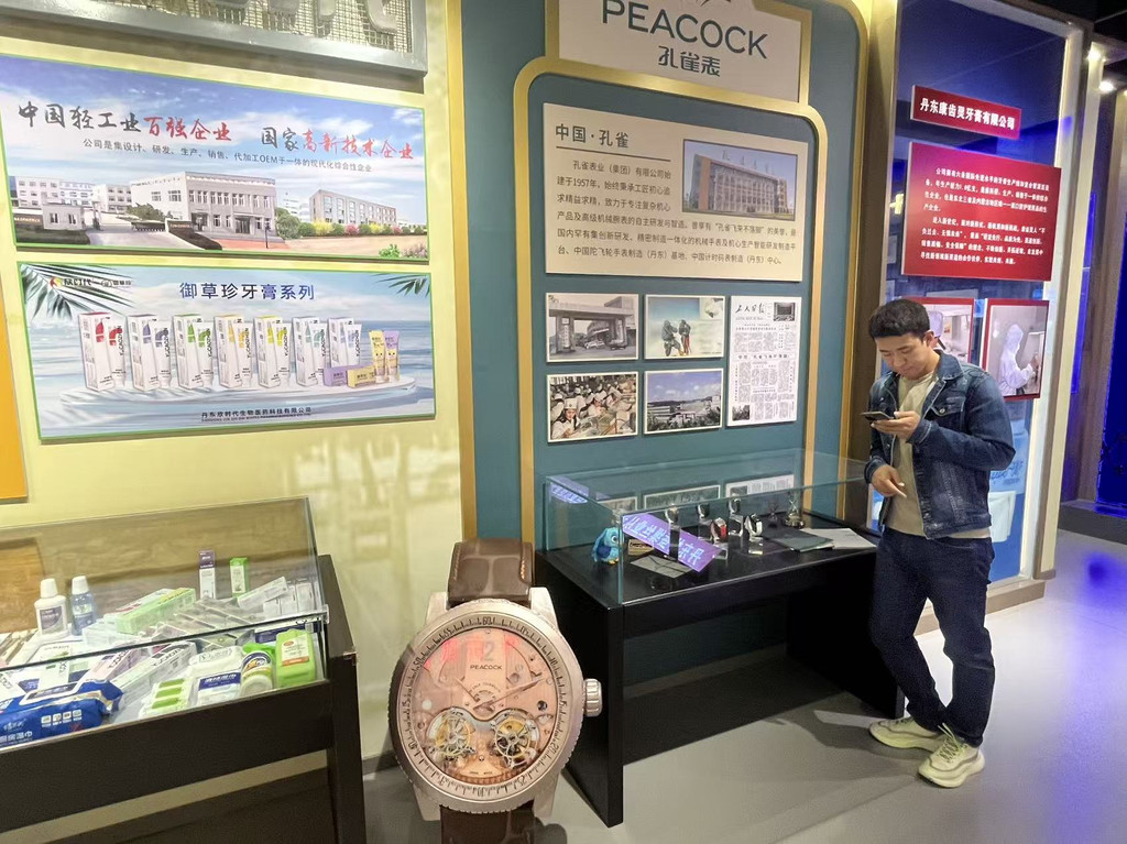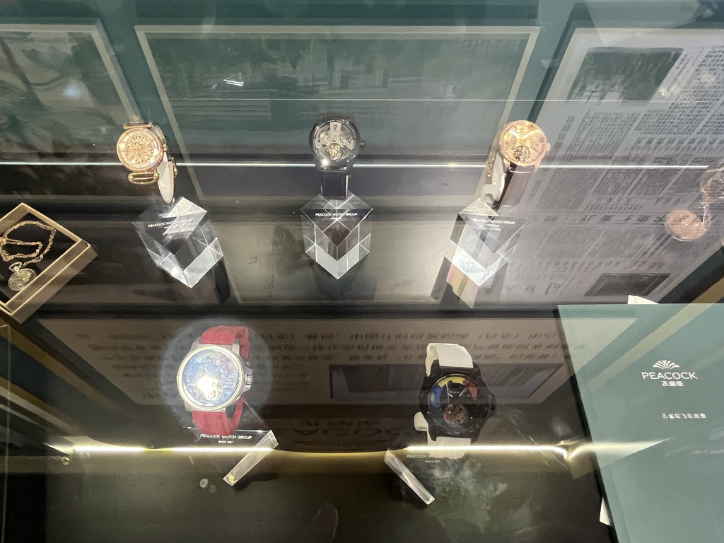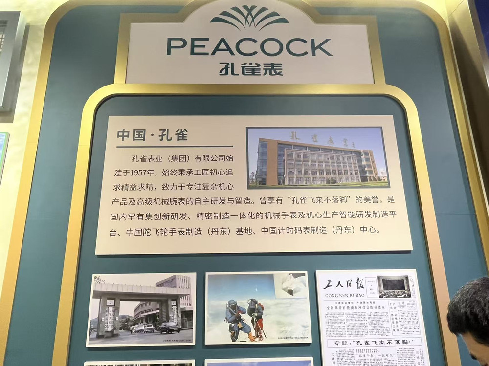 在安东老街的展陈里,一方天地被"孔雀"的羽翼轻轻覆盖——这里陈列的不是寻常物件,而是一段与丹东血脉相连的制表传奇,是机械与匠心在时光里淬炼的诗篇。一、橱窗凝光:孔雀开屏的珠宝匣正对视线的玻璃展柜,像被晨曦吻过的珠宝匣,通透而温润。"PEACOCK 孔雀表"的金字招牌斜斜映在柜面,与背景若隐若现的报纸纹路交织,仿佛旧时光里的广告页正缓缓飘落。上层三块腕表如明珠缀枝:金色表盘流转着贵气的光泽,黑色表盘沉稳似夜,玫瑰金色表盘则带着暖调的优雅,它们被透明支架轻轻托起,表盘上的指针定格在某一时刻,像是等待被重新拨动的记忆。下层左侧,红色表带与蓝色表盘撞出活泼的撞色,像丹东初春枝头新绽的樱;右侧黑白表带缠绕着彩色表盘,仿佛老胶片里跳动的帧,记录着不同时代的审美。左下角的小盒半开着,隐约可见怀表或项链的轮廓,像是藏着未说完的故事——这些展品被精心陈列,每一道反光、每一处棱角,都在诉说着"孔雀表"对细节的极致追求。二、岁月留痕:从1957到当下的足音展柜旁的展览板,以蓝绿色为底,金色边框勾勒出庄重的轮廓,标题"中国·孔雀"四个字力透纸背。上方"孔雀表业(集团)有限公司始建于1957年"的文字,像一把时间的钥匙,瞬间打开半个多世纪的记忆:从建厂初期的简陋车间,到如今"中国陀飞轮手表制造(丹东)基地""中国计时码表制造(丹东)中心"的辉煌,"始终秉承工匠初心追求精益求精"的承诺,刻进了每一枚机芯的齿轮里。照片墙上的旧影尤其动人——泛黄的工厂老照片里,穿工装的工人围在机床旁,专注的神情与今日匠人一脉相承;"孔雀飞来不落脚!"的《工人日报》标题,以遒劲的笔触定格了当年"国内罕有集创新研发、精密制造一体化的机械手表及机心生产智能研发制造平台"的荣光。这些文字与影像,让展柜里的腕表不再是冰冷的工艺品,而成了丹东工业精神的活化石。三、匠心延伸:机械与生活的和鸣再往展陈深处,一块玫瑰金镂空机械腕表占据中央,棕色皮质表带泛着温润的光,透过镂空的表盘,精密的齿轮如一朵绽放的机械花,每一次想象中的转动,都带着匠人校准时的呼吸。它左侧的玻璃柜里,瓶瓶罐罐的日用品(绿色、蓝色、白色的管状与瓶装容器)或许曾是工厂时代的日常,与制表工艺形成微妙的呼应——精密不止于腕表,更渗透在丹东制造的每一处细节里。右侧黑矮柜上的透明展柜,则藏着另一份精致:几枚戒指在灯光下闪烁,蓝色小熊摆件憨态可掬,像是给硬核的机械世界添了一抹柔软。墙上的品牌展板,将"中国轻工业百强企业"的荣誉与历史照片并置,而远处那位低头看手机的男子,与红色展板上密集的文字信息,又让这场展览与当下产生奇妙的链接——传统与现代,工业与生活,在这里完成了无声的对话。这方展陈,是安东老街的"表里乾坤"。"表"是孔雀表业精工细作的腕表,是齿轮间跳动的丹东时间;"里"是六十多年坚守的工匠精神,是机械与人文交织的城市记忆。当游客驻足凝视,仿佛能听见1957年第一台机床的轰鸣,能看见匠人指尖校准齿轮的专注,更能触摸到丹东这座边境小城,在时光长河里用精密与匠心写就的独特诗行——正如标题所言,《表里乾坤·孔雀衔来的丹东时光》,孔雀不仅衔来了精美的腕表,更衔来了丹东人骨子里的执着与浪漫,让每一枚"孔雀表"都成了这座城市的时光印章。