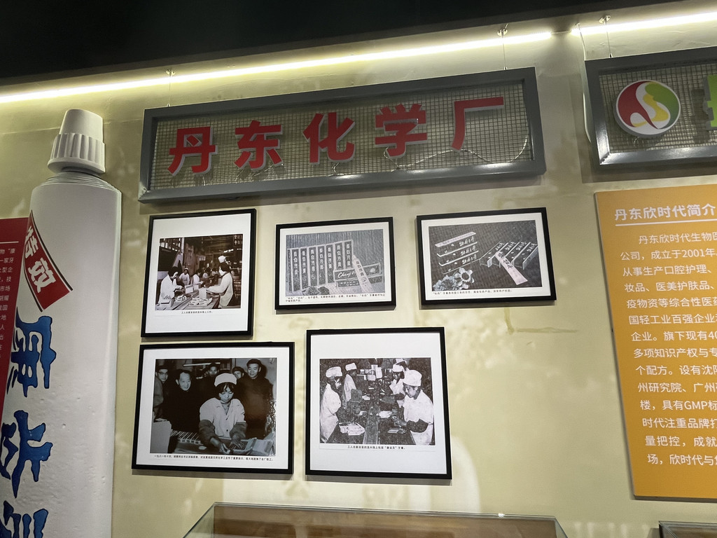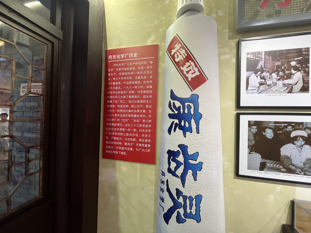 在安东老街的展陈里,一方天地被"康齿灵"的温润气息轻轻包裹——这里陈列的不是寻常物件,而是一段与丹东人齿颊相连的民生记忆,是化学匠心与口腔健康的温柔对话。一、牙膏模型:岁月里的洁白印记正对视线的,是一座巨大的牙膏模型,如同一座微缩的纪念碑,矗立在浅黄色背景墙前。主体是纯净的白色,象征着牙膏最本真的质地;上方"康齿灵"三个蓝色大字遒劲有力,如同老厂牌匾上永不褪色的承诺;顶端那抹红色的"特效"标识,像一簇跳动的火焰,点亮了七十多年来无数丹东人对口腔健康的期待。它静静伫立,釉面泛着柔和的光泽,仿佛还能触摸到当年生产线上的温热,闻到那股清新中带着药香的独特气息。二、老照片墙:车间里的光阴故事模型右侧上方,两幅黑白照片如时光的切片,定格了丹东化学厂的生产瞬间。照片里,工人们身着朴素的工作服,专注地操作着设备,有的俯身检查牙膏管装填,有的手持工具调试机器,他们的身影被岁月打磨得模糊,却依然能从坚定的眼神和利落的动作中,感受到那份对工艺的执着。这些影像与展板上的文字相互映照——"一九八零年全国牙膏质量检测中,'牡丹''长白'等三种牙膏都获满分,这在三十三家参加评比的企业中是唯一的一家","胡耀邦总书记亲临该厂视察,对发展我国日用化学工业做了重要指示"……每一个细节都在诉说着"康齿灵"如何从丹东走向全国,成为几代人记忆中的"特效牙膏"。三、品牌传承:从化学厂到医美集团展陈左侧的红色展板,以"丹东化学厂历史"为题,将七十多年的光阴娓娓道来;而右侧的橙黄色展示牌,则揭开了今日的篇章——"丹东欣时代生物科技有限公司",这家脱胎于老化学厂的综合性医药集团,依然延续着对品质的坚守:"专业从事生产口腔护理、化妆品、医美护肤品、防疫物资等","旗下现有40多项知识产权与专有配方","注重品牌和质量"。从"康齿灵"牙膏到如今的多元产品线,变的是技术与市场的拓展,不变的是丹东人对"健康守护"的初心。嵌入式照明灯带温柔地洒下暖光,为整个展陈镀上一层怀旧的滤镜。当参观者的目光掠过牙膏模型的弧线、老照片里的笑容、展板上的荣誉,仿佛能听见上世纪八十年代车间里机器的轰鸣,能闻到牙膏管拔盖时那股熟悉的清香,能触摸到丹东这座城市在民生细节里沉淀的匠心——这方展陈,是《膏泽流芳·丹东齿间的岁月清欢》,"膏泽"是牙膏带来的健康滋养,"流芳"是七十多年品牌的绵长传承,"岁月清欢"则是丹东人与"康齿灵"共同书写的,关于洁净、健康与温暖的平凡诗篇。