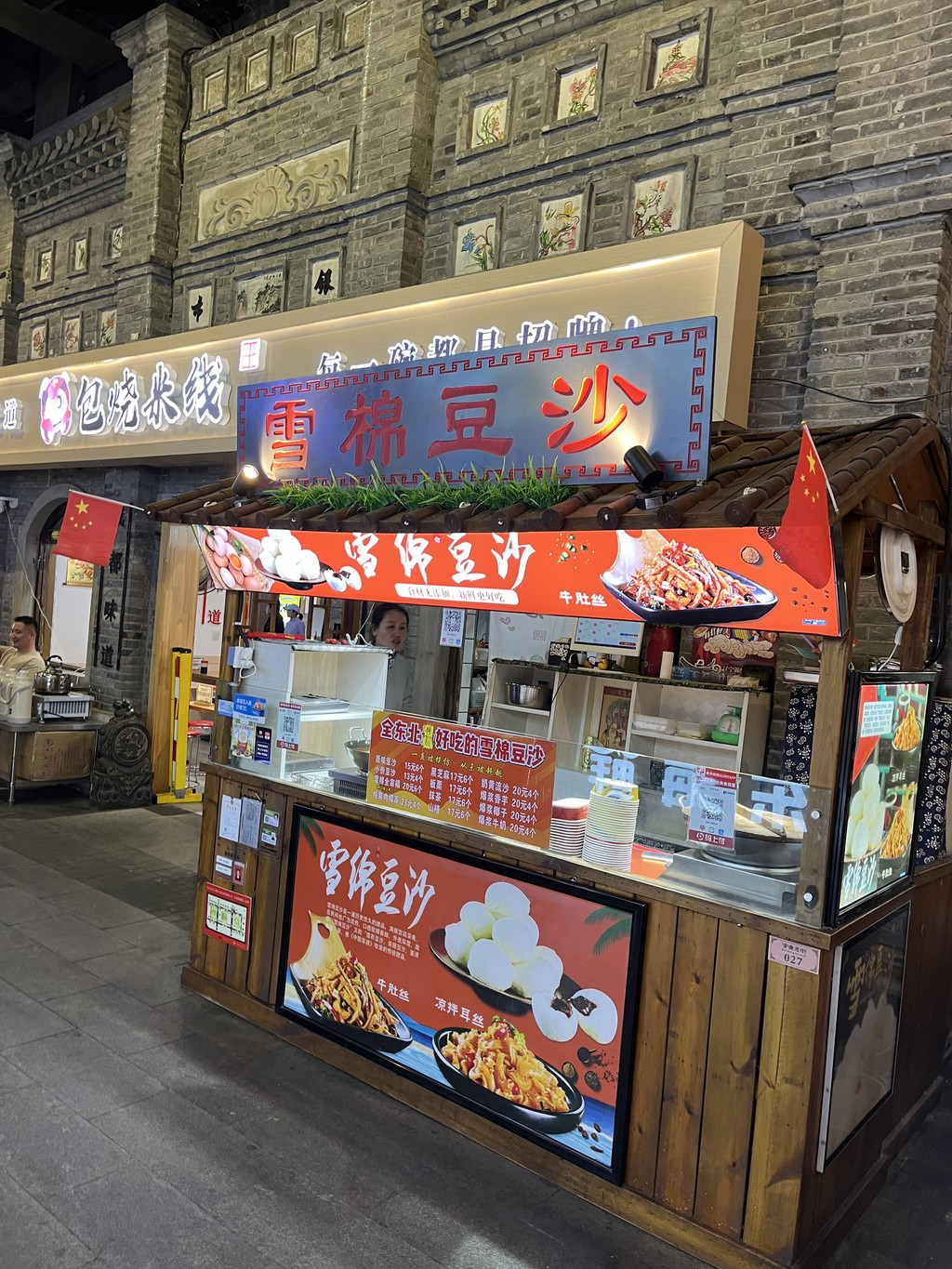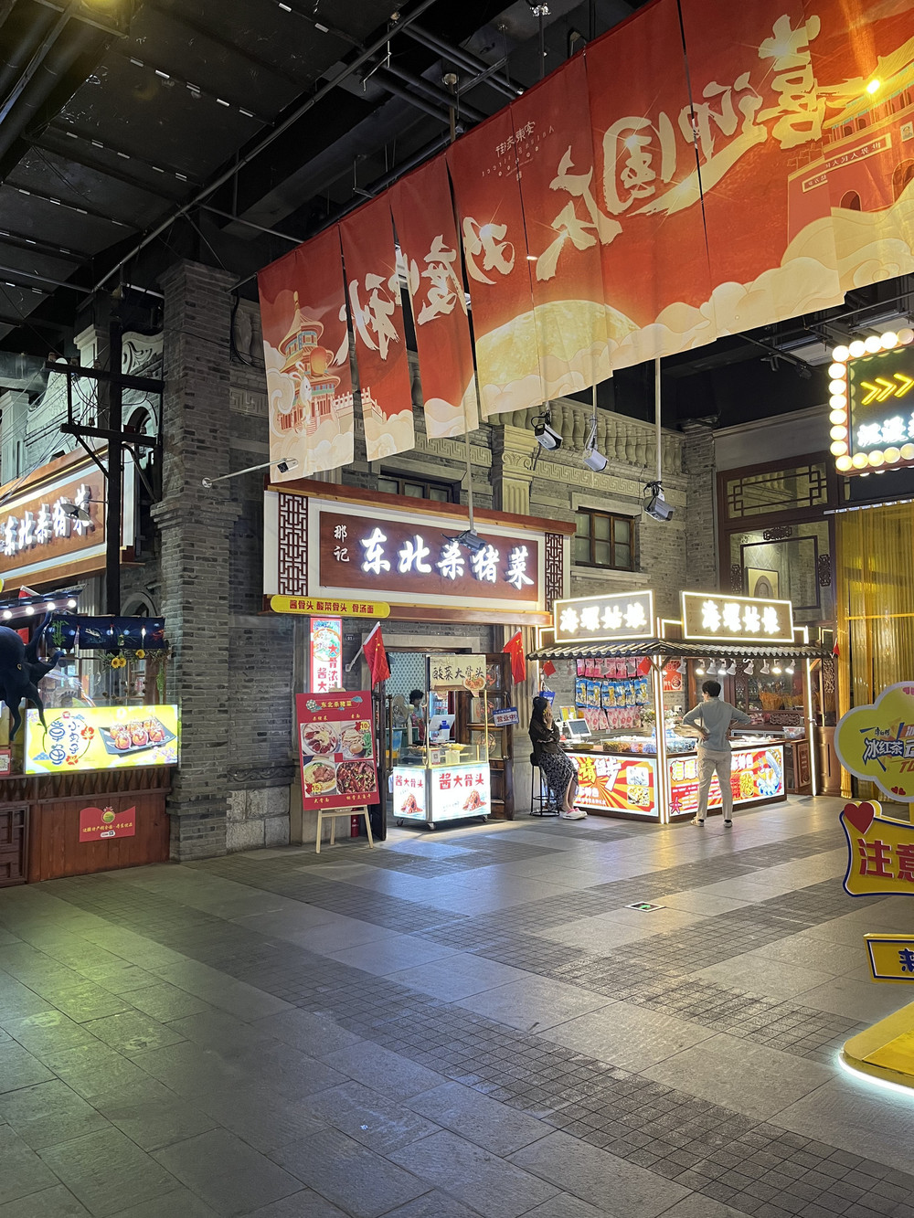 暮色初染安东老街,青石板路两侧的灯火次第亮起,将市井烟火烘托得愈发鲜活。这里的一食一味,皆是时光里沉淀的乡愁,是边城人用舌头记住的岁月诗行。转角处,一座木质结构的古朴摊位最先撞入视线——“雪绵豆沙”的蓝底红字招牌悬于上方,下方橙色横幅以同样的字样呼应,搭配着油亮的菜品图片,像在热情招呼着往来食客。摊位玻璃柜里,白瓷餐具整齐排列,柜面贴着的宣传海报上,雪绵豆沙与牛肚丝的影像诱人垂涎。掀开柜帘,甜香与肉香便缠缠绵绵地涌出来:那雪绵豆沙定是用本地红豆沙细细熬煮,搓成圆子裹上蛋清糊,入油锅炸至表皮微黄,捞起时外层如初雪般蓬松,咬开却是绵密的红豆香,甜而不腻,恰似冬日里捧在手心的暖炉;牛肚丝想必是新鲜牛肚切得细密,用秘制酱料爆炒,筋道弹牙间裹着醇厚汤汁,每一根都吸饱了烟火气的精华。摊位前,工作人员正熟练地打包点心,木勺与瓷碗相碰的清脆声响,混着食客的轻声赞叹,成了老街最动听的背景音。相邻的“包烧米线”摊位同样热闹。蓝黄格纹的摊布上,一碗碗米线热气腾腾,红汤翻滚着辣椒的鲜亮,米线滑溜溜地浸在汤里,吸饱了汤汁的鲜香。摊主麻利地抓起一把米线放入碗中,浇上熬得浓稠的汤底,撒上香菜、花生碎,再淋一勺秘制红油,动作一气呵成。食客们捧着碗站在摊前,吸溜米线的声音“哧溜哧溜”响成一片,连空气里都飘着米香与辣味交织的酣畅。不远处,“东北杀猪菜”的招牌带着质朴的豪迈。门前立着的海报上,大盆杀猪菜正“咕嘟咕嘟”冒着热气——酸菜是秋后腌得透亮的白菜切丝,衬着五花肉片、血肠和手掰的土豆块,在铁锅里翻滚出浓白的汤汁。摊主掀开锅盖的瞬间,酸香与肉香便霸道地弥漫开来,仿佛能看见从前杀年猪时,家家户户围炉炖菜的热闹场景:邻居们端着碗来蹭一口热乎的,孩子们踮着脚等着吃血肠,大人们则就着酸菜白肉喝上二两烧酒。如今这口锅搬到了老街,汤里依旧浮着厚厚的油花,酸得开胃,香得直沁脾肺,是冬日里最温暖的慰藉。“海慧姑娘”的摊位则像一颗亮眼的星子。红色横幅上的金色字体与图案在灯光下闪烁,摊主坐在椅子上,面前摆着热气腾腾的美食,或许是刚出锅的烤冷面,或许是秘制的炸串。一位身着浅色衣服的男士正站在摊前,与摊主笑着交流,或许是在询问口味,或许是在分享对老街美食的回忆。摊位周围,食客们三三两两地围坐着,边吃边聊,笑声与食物的香气一起,在老街的夜色里飘得很远。这些美食摊,是安东老街的“活招牌”。雪绵豆沙的甜、杀猪菜的酸、包烧米线的辣、烤冷面的香,每一种味道都裹着边城的风,每一种香气都连着岁月的根。它们在青石板路上升腾的烟火,是丹东人把日子过成诗的方式,也是这座边境小城留给每一个过客最温暖的乡愁印记。