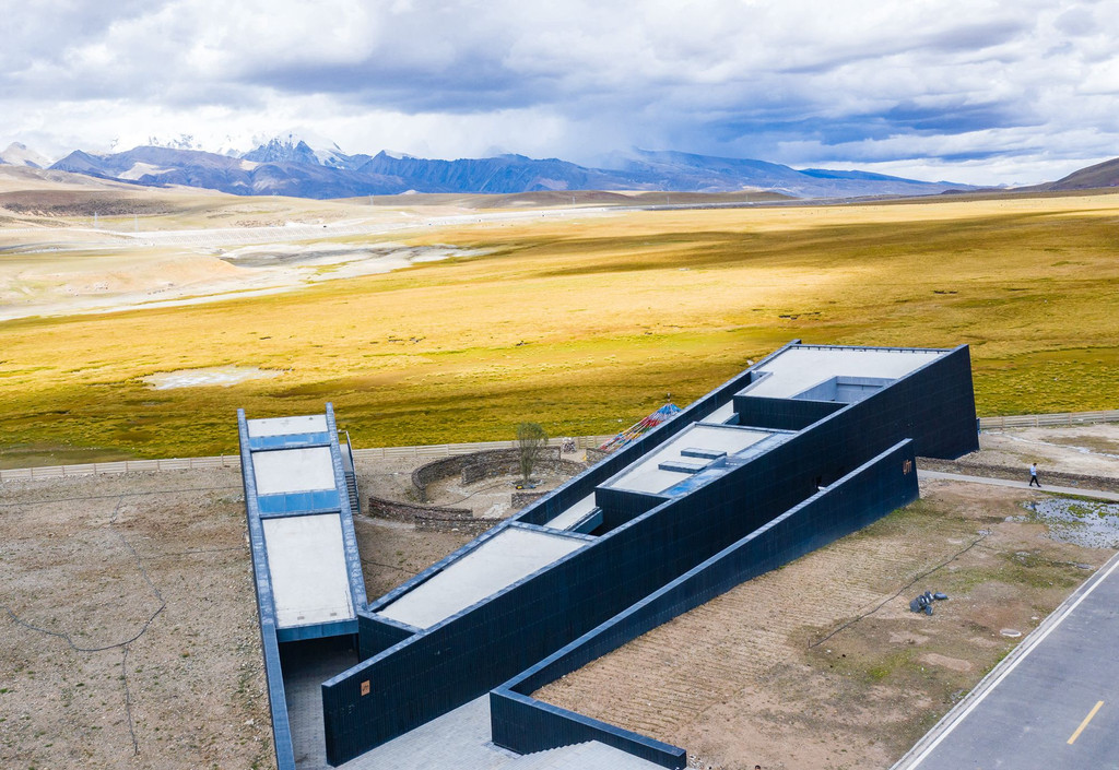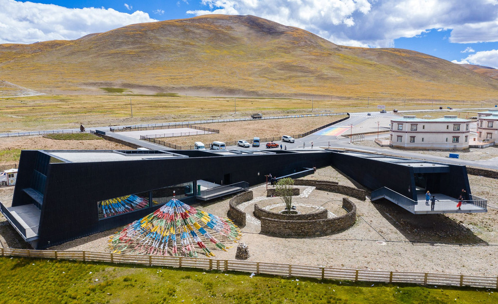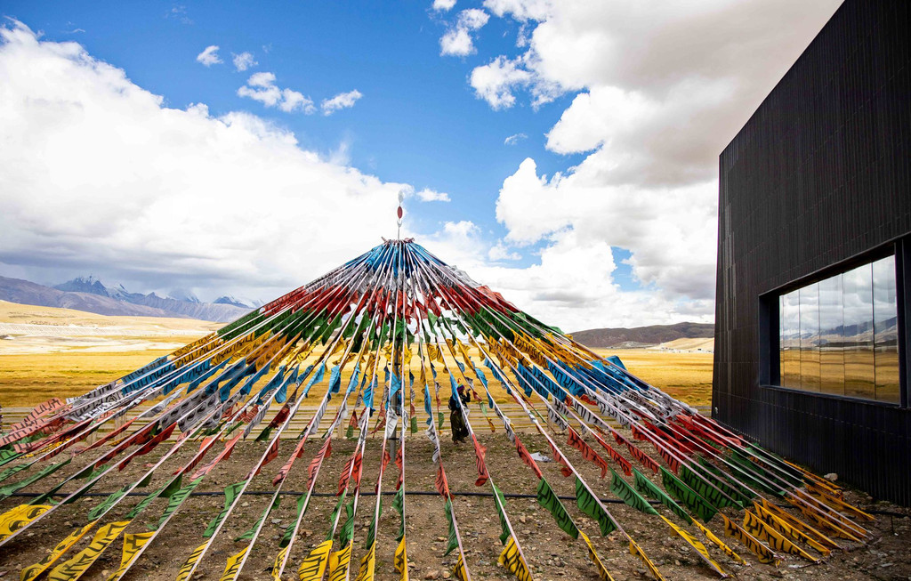 圣湖之水源自圣山,念青唐古拉山横穿当雄全境,分隔出了藏北、藏南和藏东南,也是雅鲁藏布江和怒江的分水岭。行者·黑帐篷位于当雄县境内的羊八井镇,海拔4300米,周围是生态优越的羌塘草原,是拉萨通往圣湖纳木错的公路边遥望念青唐古拉山主峰的观景台,也是过往游客的休息站。黑帐篷是典型的藏北游牧文化象征,别出心裁的设计与周边环境自然融合,从下沉广场到心灵邮局,我们经历了从谦卑、寂静、朝圣、祈福、感悟、自在到传递这七个过程,面对念青唐古拉山的朝圣,也是一次内心的洗礼。