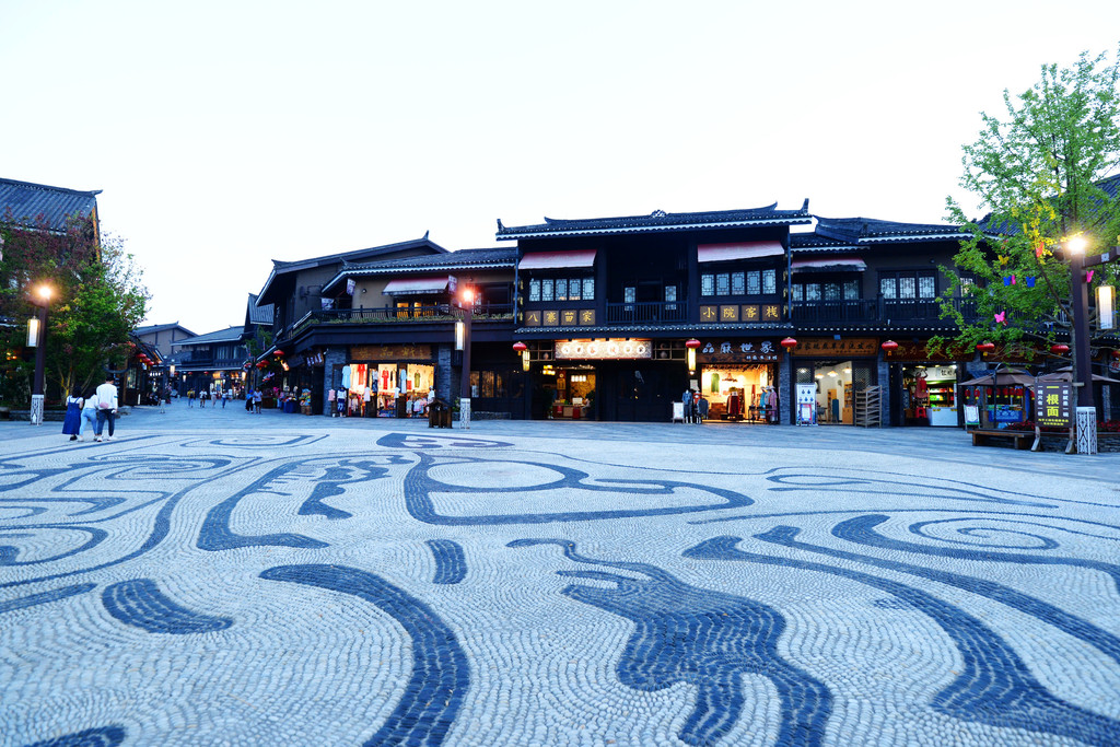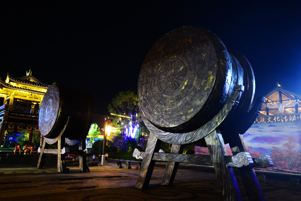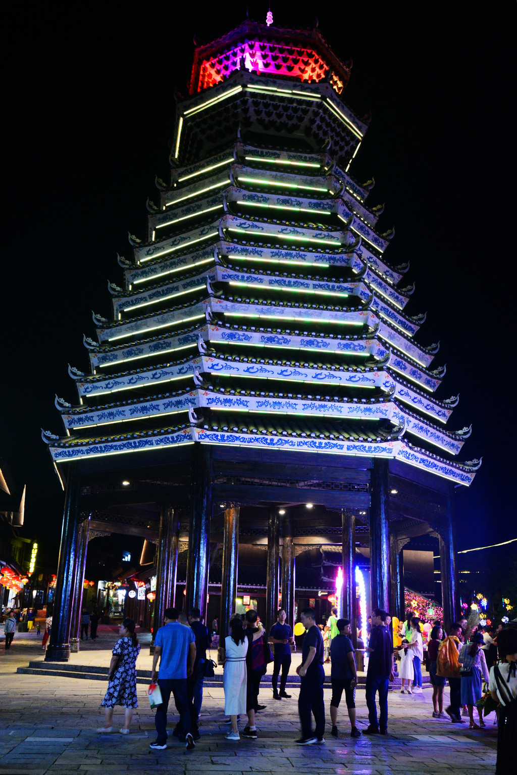 在侗族历史上,鼓楼既是商榷重大事宜的场所、也是抵御外侵的哨所、还是举办大歌等各种活动的舞台,可见对于侗族人来说,鼓楼有多重要。在万达小镇的鼓楼广场上,建有一座十三层高的侗族鼓楼,巍然挺立,站在鼓楼底下往上看,每一层都绘有山水、花卉、龙凤、飞鸟、古装人物的图案,层层叠叠,一层比一层小,呈宝塔形,高达数十米,让人不由得惊叹这宝塔状建筑的恢弘气势。