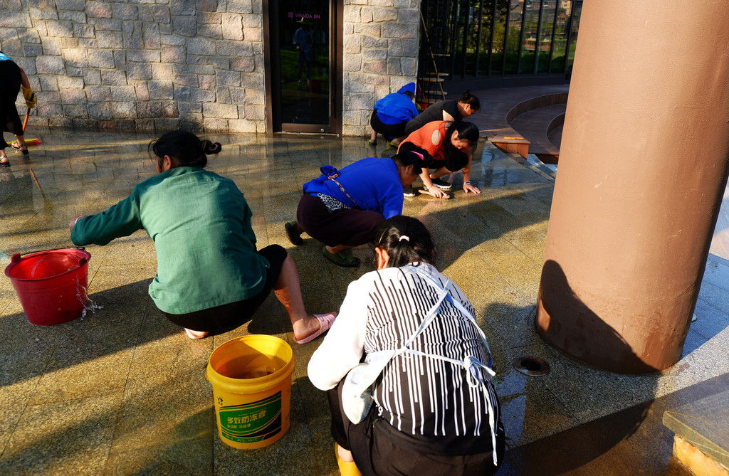 请来的民工正在擦洗地面,纯手工的操作。