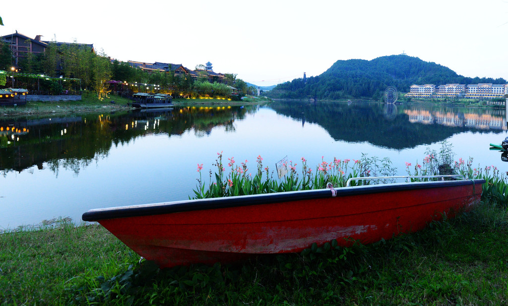 岸边停靠着几十艘游船和竹筏,游客在这可享受划船的乐趣。