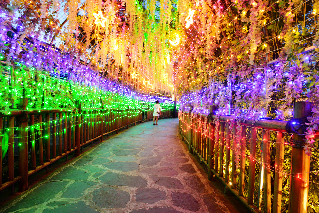 沿着湖边走,经过一条彩虹长廊,不少女子在此打卡拍照。