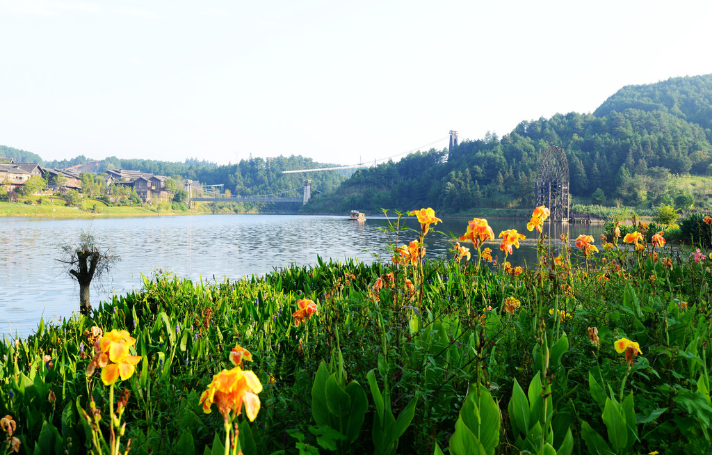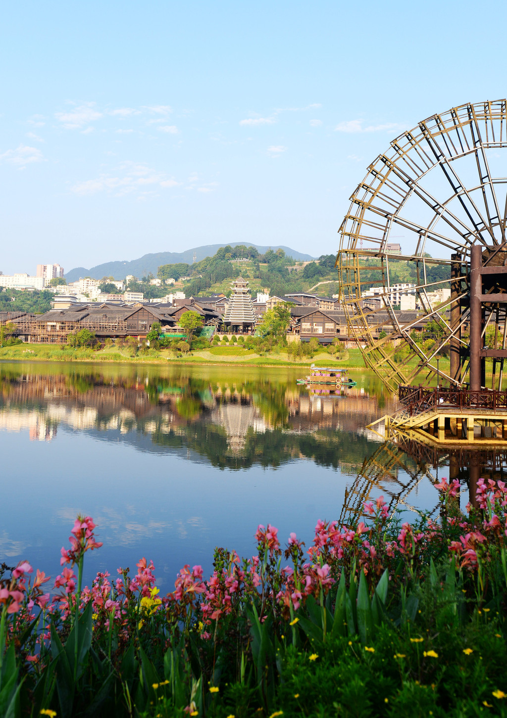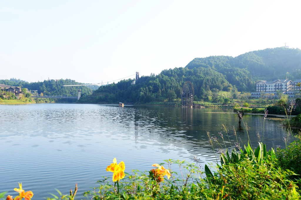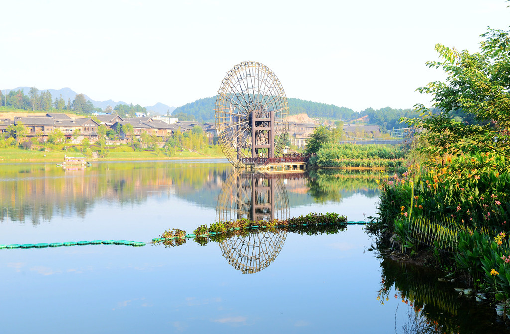 近景是花,中景是大水车,远景是山,不要太美好了,呼吸之间都是满满负氧离子的味道。