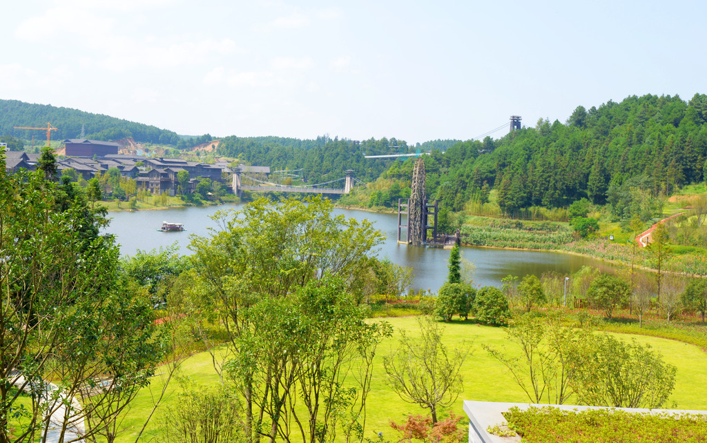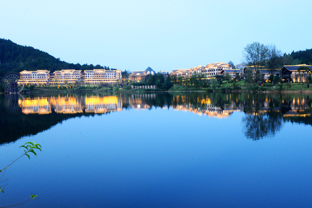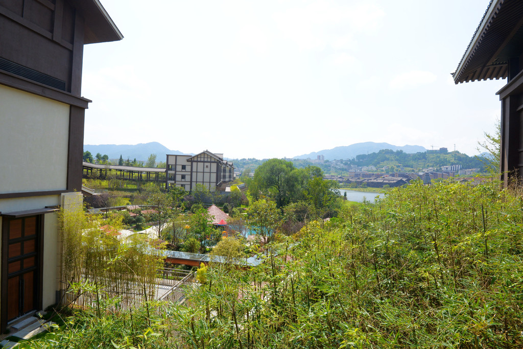 换到竹筏上再看万达锦华温泉酒店,简直是一幅画。