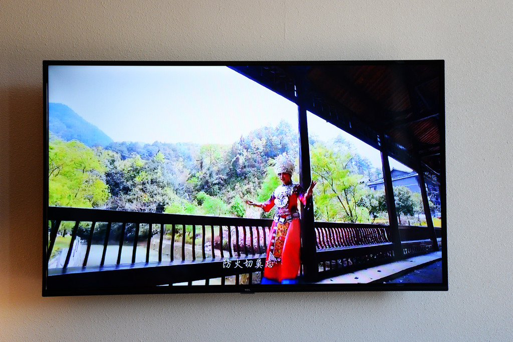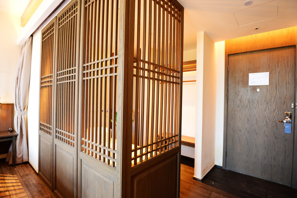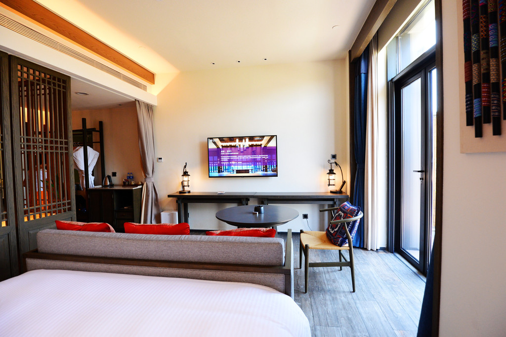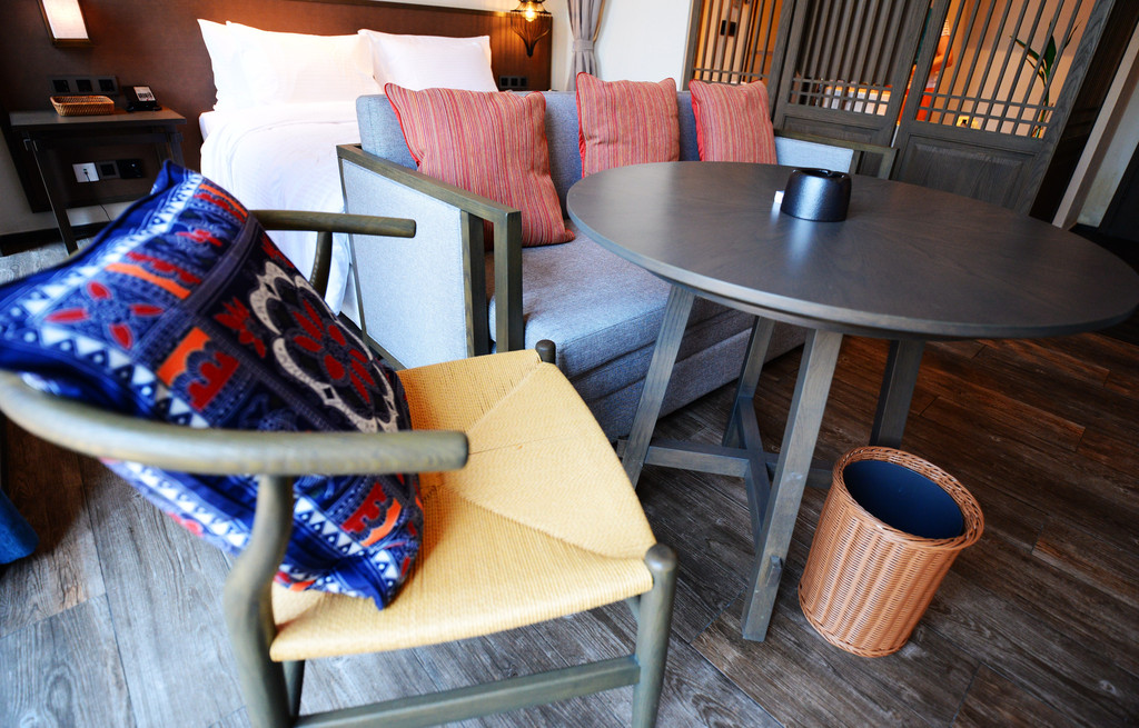 我刷卡进人北区101房,木制家具配上灰白色调,显得非常淡雅,又同时加入一点蓝色的装饰点缀,跳跃的色彩展现苗乡人民的热情。