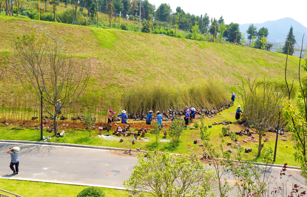 酒店不仅养活了两百多员工岗位,还解决了附近百多人来做园林工,民工们有的在栽竹子,有的在移植花草,难怪都说这里是万达对丹寨县的扶贫基地。