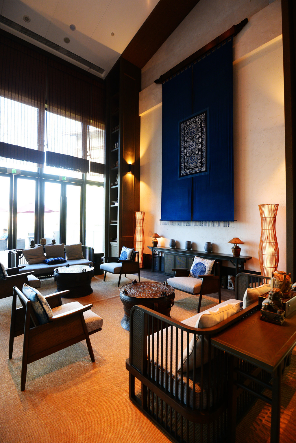 大堂摆放的沙发座椅全都是中式全手工的实木沙发,为了防止硌人,酒店还细心地放着有苗族图案的蜡染靠枕,柔软舒适,在这里既可以等候、休憩,眺望窗外的园林美景,也可以享受精美的咖啡、茶饮、下午茶、甜点等,是休憩商谈的理想场所。