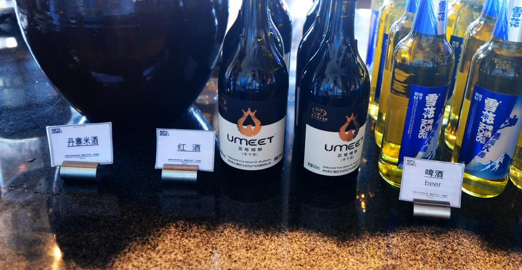不论是文人雅士,还是商界精英,生活中怎么能离得开酒呢,酒鬼们可放量喝,丹寨米酒、雪花啤酒你好哪一口,更有茅台集团生产的蓝霉精酿红酒大方地摆放在酒水区,不限量,喝得会笑出声来。
