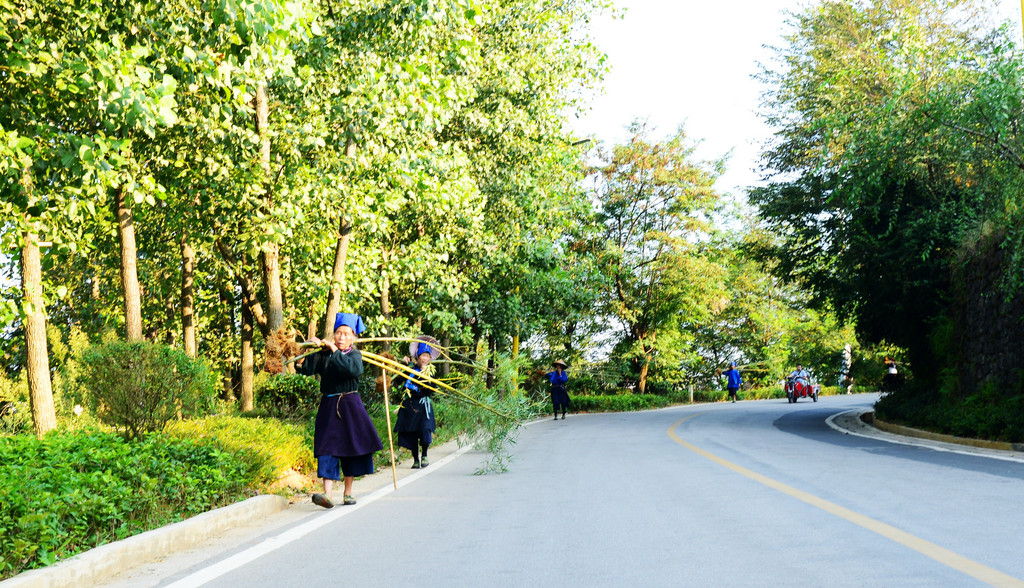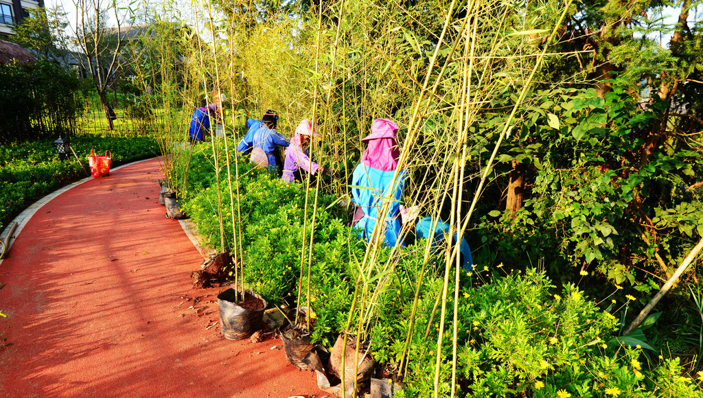 请看,又在上绿化工程了,前面是有人肩扛着将移栽的竹子后面是货车装载着,你这是打算要大家醉氧的节奏吧。