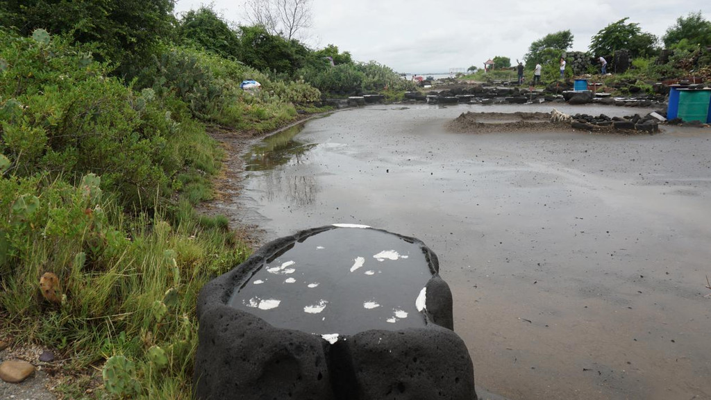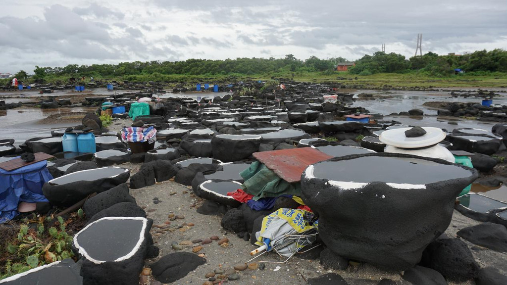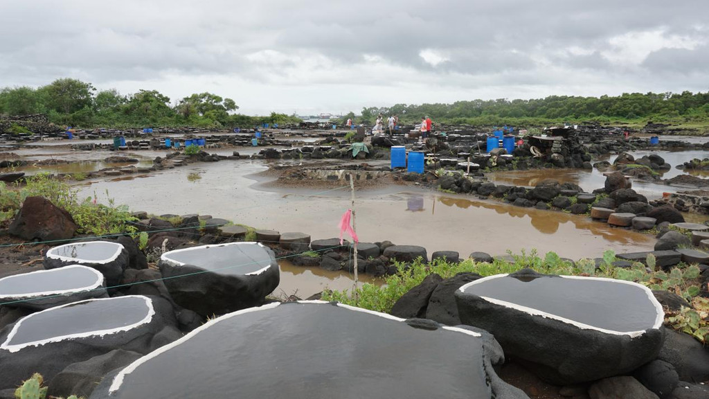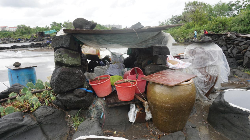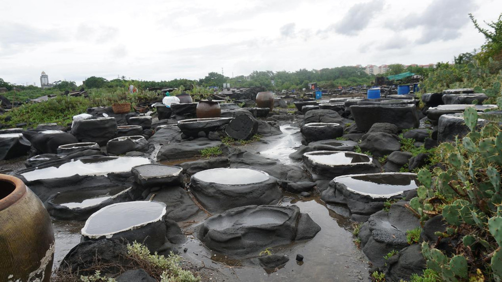 制盐过程中需随时关注潮汐、风雨、阴晴等天气变化。面朝大海,海水从黑色火山岩的夹缝里缓缓地流到岸边滩涂上。这些看上去像烂泥塘似的其实是晒盐池,池底是坚硬不透水的硬胶泥。涨潮时海水就自动充满了盐池,退潮后用木耙将盐泥耙松,让阳光和海风带走了水分,这些浓缩的海水中带有泥沙和苦味,浓缩成盐泥。
