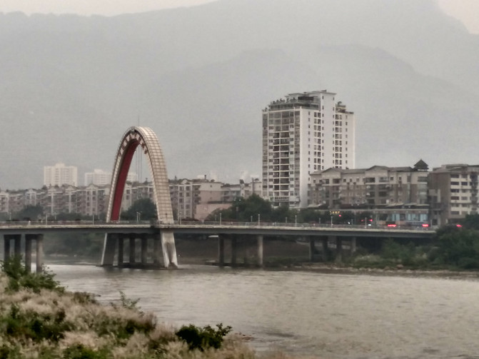 酒店就在青衣江边,不出百米就来到江边。傍晚时分的雅安天空很是阴沉,我们还是去江边走了走,远观了青衣江上的廊桥与彩虹桥。