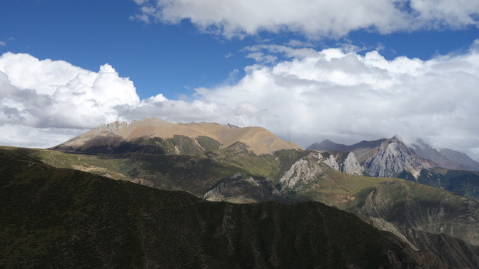 翻越兔儿山(海拔4696米)、海子山(海拔4602米),理塘到稻城一路上风景宜人,天上大朵大朵的白云,比棉花糖大多了。一路上的植被不算茂密,能看到一些浅滩,山路蜿蜒无论如何开不快,有些地方修路依然尘土飞扬。开车遇到藏民赶着牦牛群,一定要减速慢行,否则会惹上麻烦。