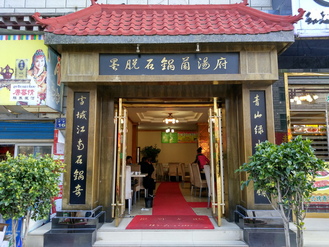 小镇上家家餐馆都有石锅鸡,旅馆店主推荐这一家,进店一看,石锅鸡正在火上炖着,美哉。