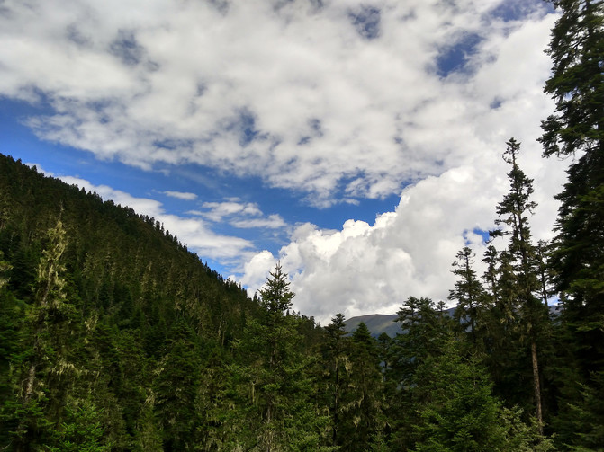车子行驶在大山之间,新修的柏油路尚未褪色,蓝天白云相交辉映,能沐浴在此景里,一切的浮华都已退却,只愿与这神圣的自然合二为一。