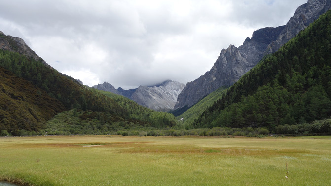 秋天的亚丁,大地被浓墨重彩涂抹,你不仅可欣赏云遮雾绕的漫漫雪山,而且还能将蓝天下被秋色染黄的景色尽收眼底。亚丁的天气变化无常,可能是海拔较高的因素,在洛绒牛场(海拔4150米)雪山始终隐藏在云雾之中,并不时伴有阵阵细雨而来,迈央勇雪山一直未露尊容。