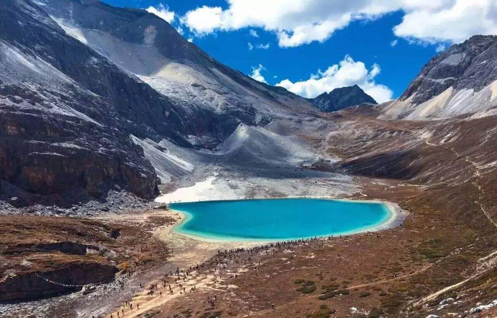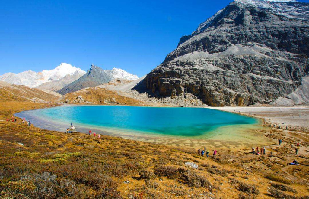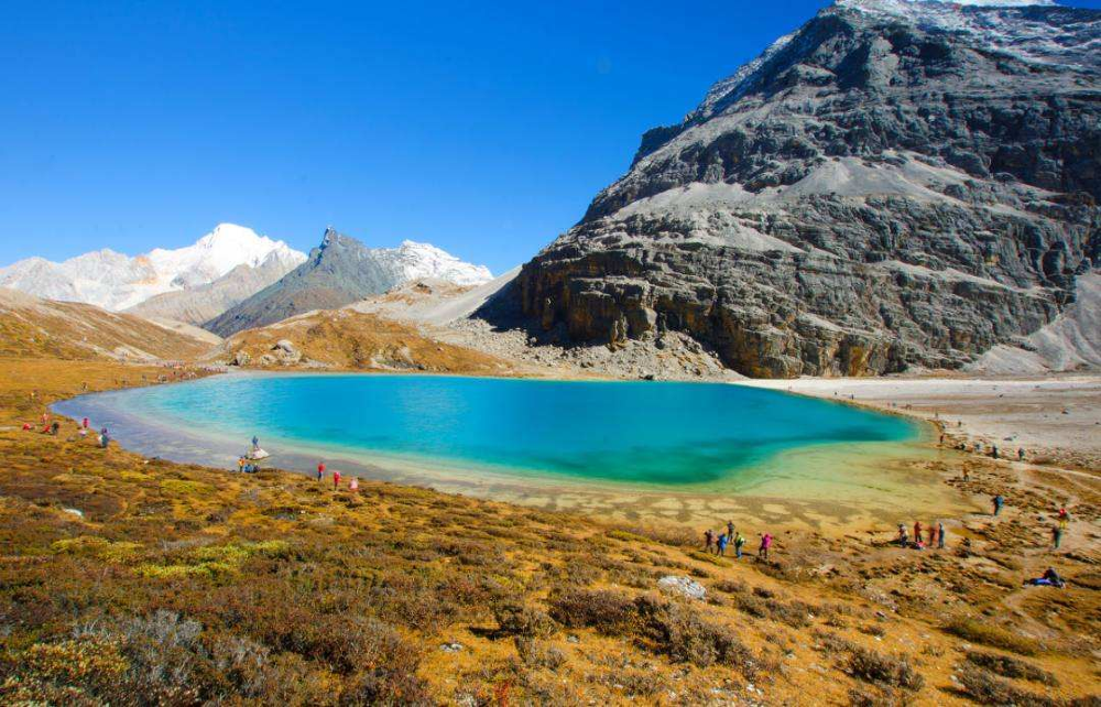 牛奶海,又叫俄绒措:古冰川湖,状如水滴,面积0.5公顷,四周雪山环绕,湖水清莹碧蓝,山上成瀑,以其玲珑秀雅水色翠蓝而著名,俄绒措上方有大片的冰川。