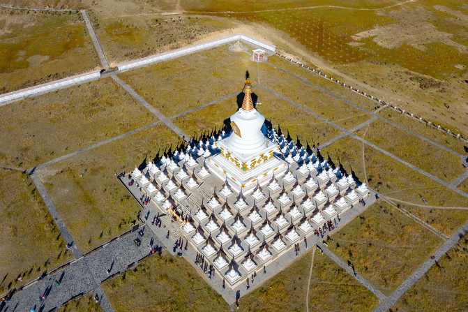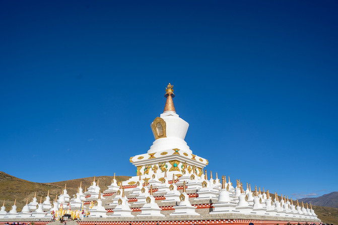 尊胜塔林由一个主塔和108个小塔组成。塔林分为五层,最高层中央为一个高大的白塔,周围排列着四层小白塔,主塔内供奉的是尊胜佛母。尊胜佛母,乃长寿三尊之一,主长寿。虽说长寿只是一种美好的寄托,但是祈求平安顺遂总是一个心安。