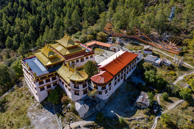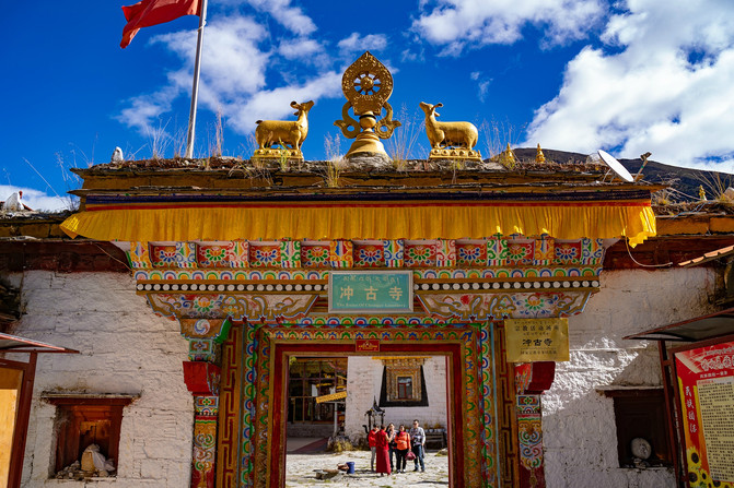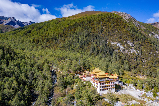 想看山,先看寺。冲古寺既是观赏三座神山——仙乃日、央迈勇、夏诺多吉的必经之地,也是当地藏族转山仪式的出发地。