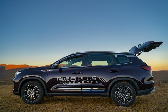 太阳西斜照在栏杆上,也照在瑞虎8 PLUS的车身上。暗紫色的车身上流淌着阳光的颜色,像是镀了一层金。
