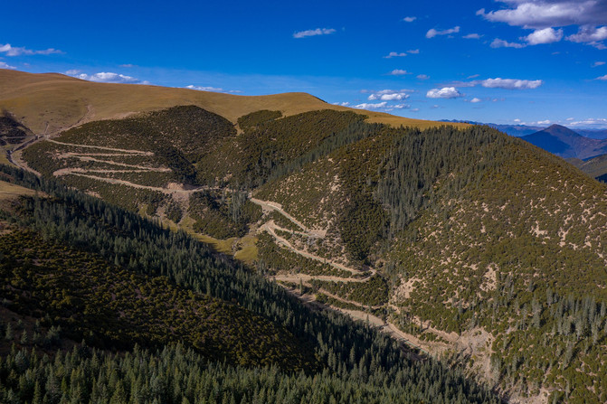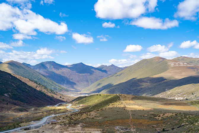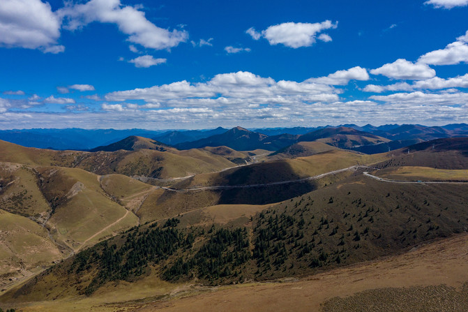 没走多远就开始进入盘山路了,很多的环形的大桥,一圈一圈地,刚开始开的时候还是有一点点紧张的。行至半山腰,回望雅江的方向,好美啊。云朵如洁白的棉絮散落在山间,极目远望峰峦叠嶂,千峰竞秀,树绿如茵。