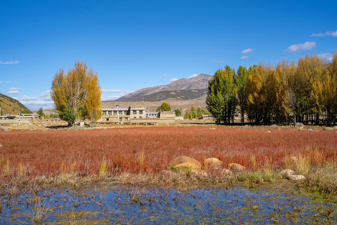 旅途的第一站就是红草地。在稻城县城以北28公里处,桑堆镇公路边,一个不起眼的小水塘,每年秋天都会布满了红色的水草,这里便是红草地。