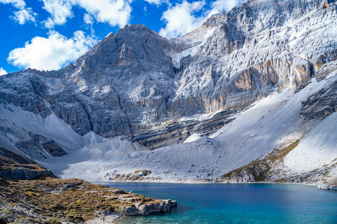 牛奶海在央迈勇山脚下的山坳里,扇贝似的形状,并不像其他的湖泊那样一望无际,绵延千里。牛奶湖面积不大,雪山把围在牛奶湖的中间,碧蓝的湖水一直绵延到山边,周边有一圈乳白色的环绕,就像是牛奶一样。
