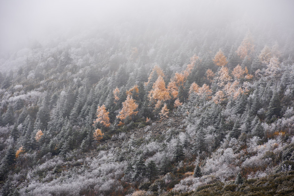 山形平缓柔和,森林广袤,其间长满层层叠叠的灌木。该处的拉姆格林区是稻城最大的林区,以云杉、红杉、高山栎为主。从峡谷往上盘行,涌入眼帘的是那层层叠叠的灌木森林,红黄绿相间,五彩缤纷,绚丽耀眼;红的妖艳,黄的明丽,绿的柔和,漫山遍野,真可谓“浓妆淡抹总相宜”,一路秋色,令人陶醉。