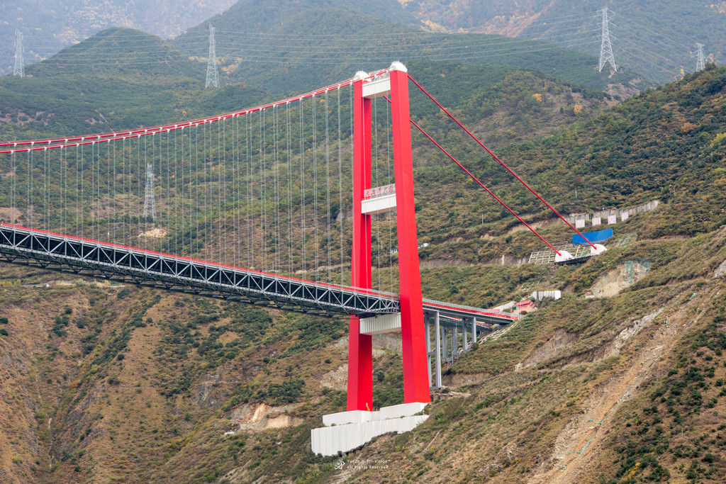 顺着高速继续往前开,穿过二郎山隧道就是泸定服务区,过了服务区,就是泸定隧道,穿过泸定隧道,就是泸定大渡河特大桥。这座桥通体红色,线路全长1411米,主跨1100米,他被誉为“川藏第一桥”,因其像其它大型桥梁一样代表着中国近年的基建成就而成为“网红桥”之一。高原上蓝天白云,披上“红妆”的兴康特大桥在阳光照射下,熠熠生辉、宏伟壮观。桥上不许停车,想要拍摄的朋友可以在泸定下高速,然后导航搜索“咱里村”,出了收费站大概行驶十几分钟即可到达,在这里我们可以看到大桥的全貌。而且无人也可以起飞,让我们尽情地拍摄吧。