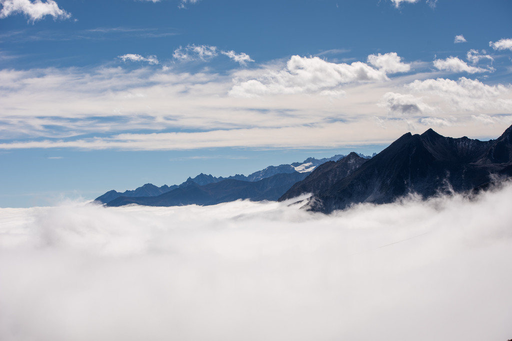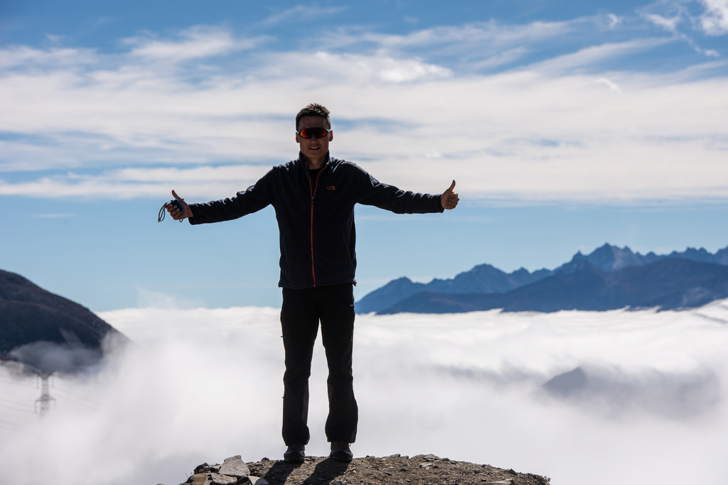 折多山海拔4298米,是康巴第一关,我们在山下的时候看到的还是灰蒙蒙的天空,没想要慢慢往上开,竟然冲破了云层,头顶蓝天,脚下云海,腾云驾雾的梦想竟然让我们在折多山实现了。