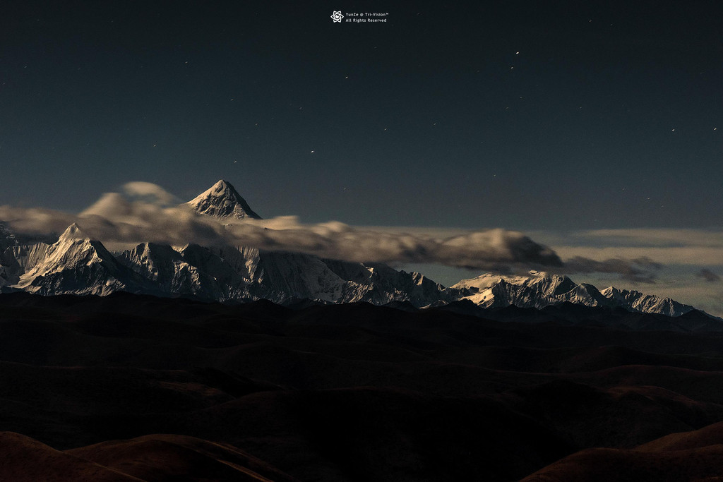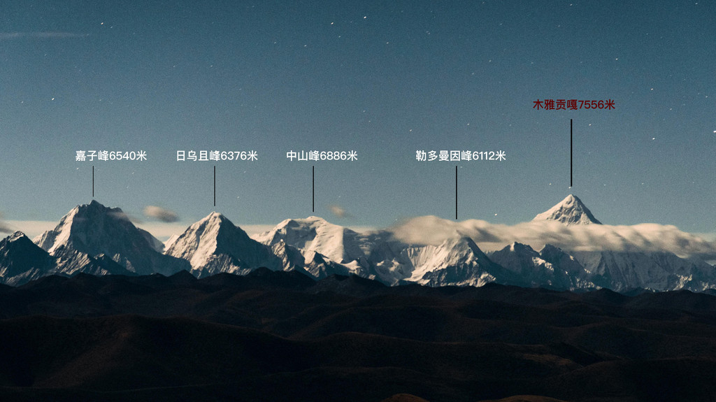 在这里,我们看到了贡嘎雪山以及周边的嘉子峰、日乌且峰、中山峰、勒多曼因峰。也是月亮的缘故,虽然看不到那么多的星星,但是可以很清晰地看到我们的雪山也弥补了我们拍不到星空的遗憾。
