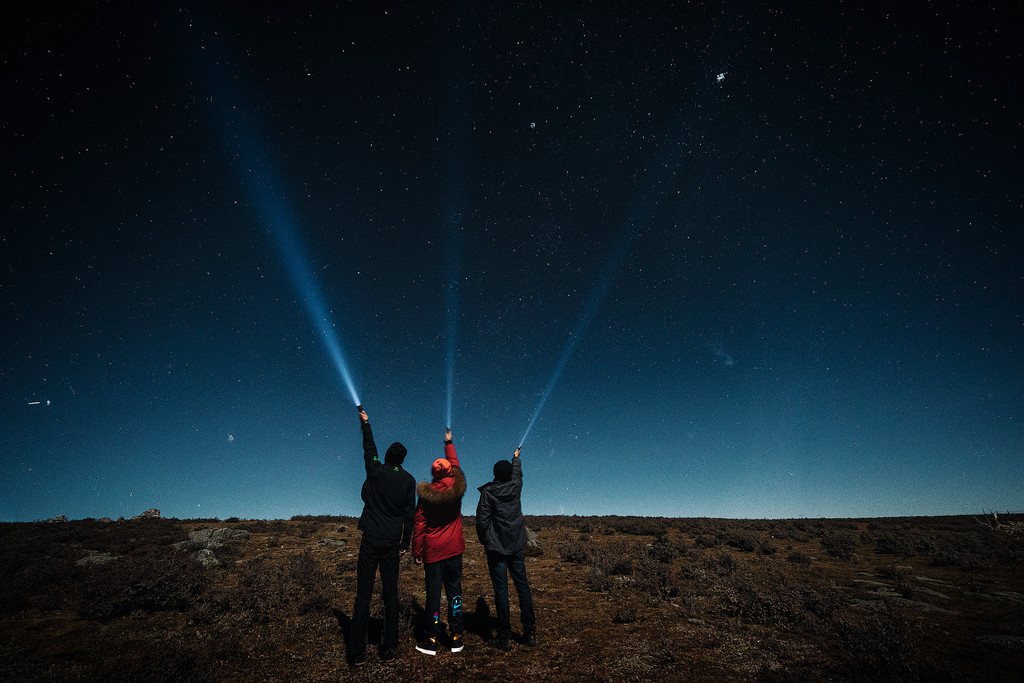 于是,我们三个老男人就踏上了寻找拍摄地点的征途。通过多方打听,我们找到了这个距离新都桥只有十几公里的地方,可以看到贡嘎雪山、亚拉雪山,而且毫无遮挡,这里就是鱼子西星空营地。在这里,三个老男孩第一次合影,拿着手电指向天空,未来可期。