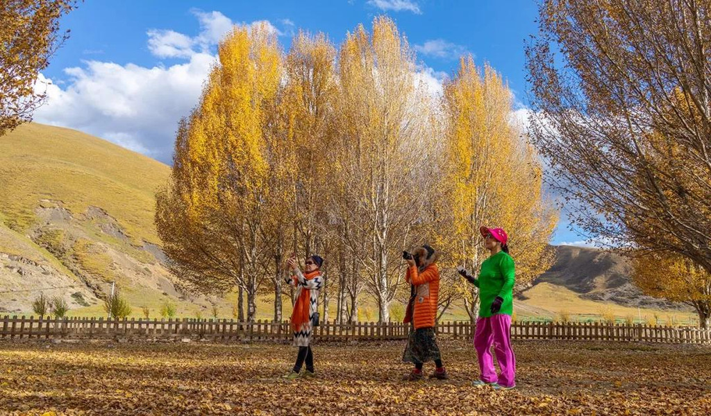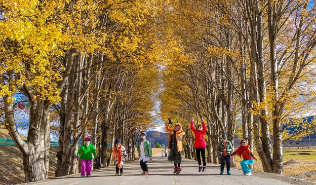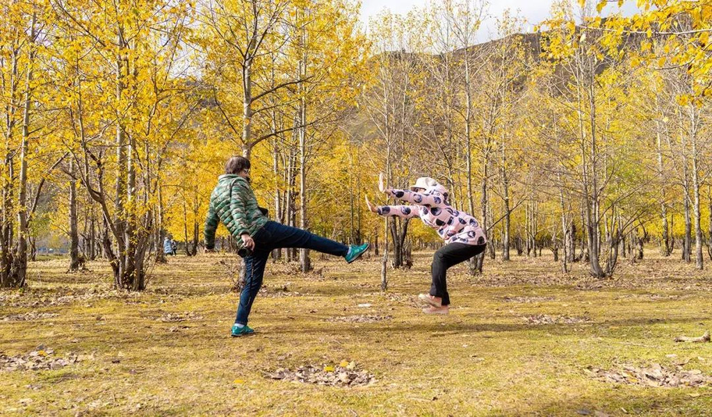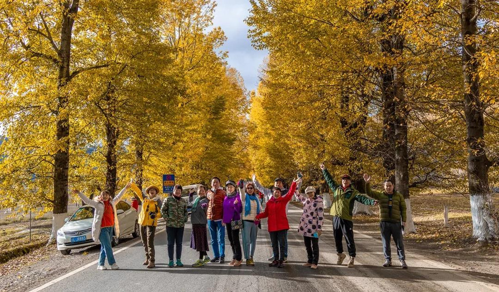 而金秋的新都桥,道路两旁“黄树成荫”,晨起的光线洒向大地,当地的藏家炊烟袅袅的升起,也总是难免会遇到图中这样的情况,就是有两个人在林中“打太极”,都成了众多摄影师喜好拍摄的风景。