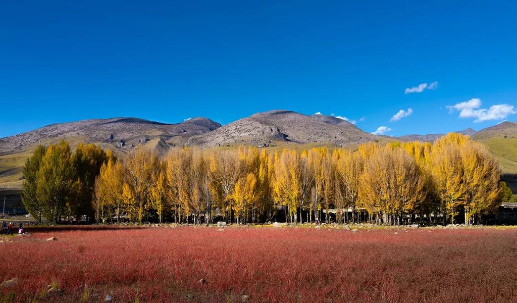 红草地,每年十月金秋才有的独特景观,也只有足够有缘分在这个时间来朝拜的信徒才能得而一见,不远处的金色青杨也相得益彰,配合着蔚蓝的天色,也绝对是一张精美的明信片。
