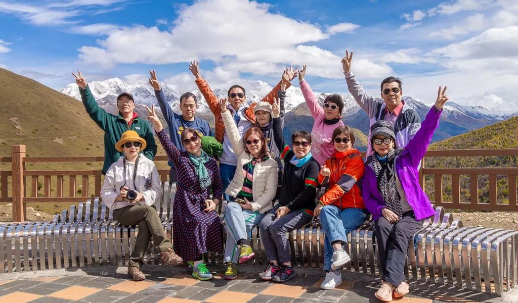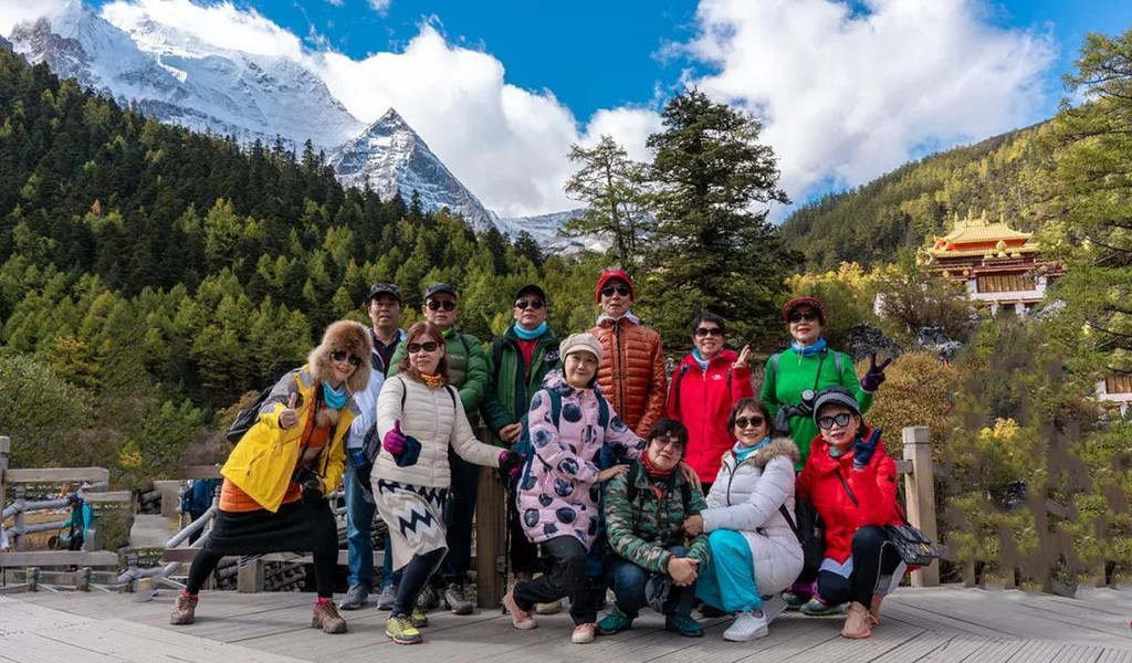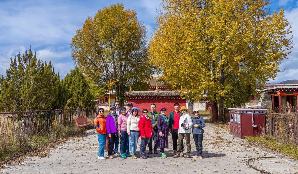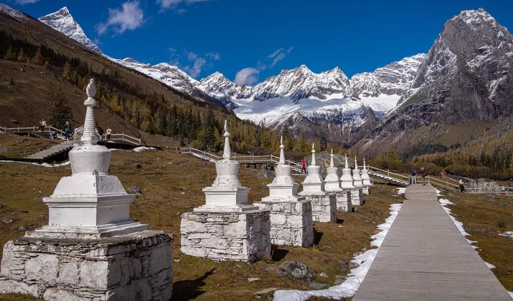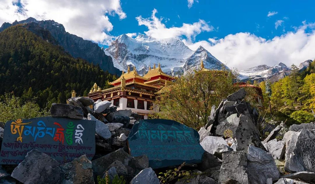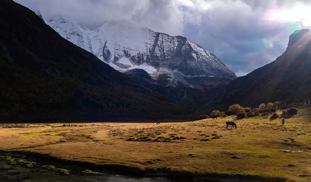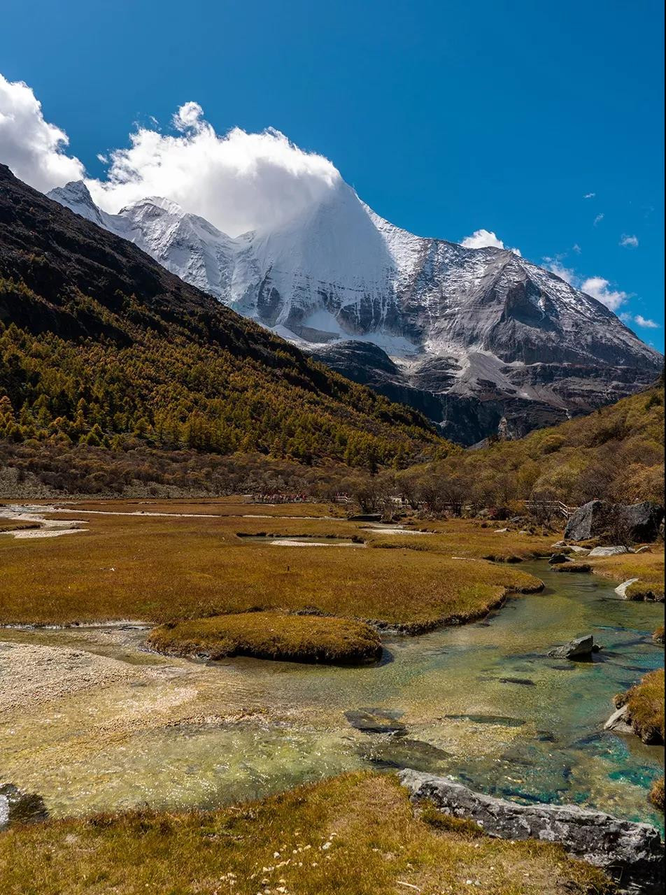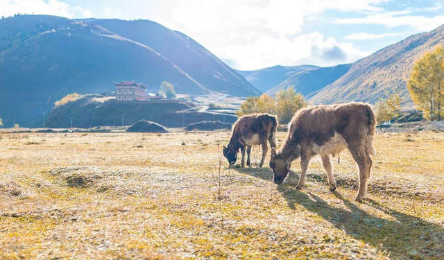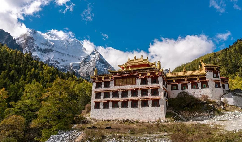 沿着小道逐步前行,我们来到了冲古草甸,冲古寺背靠着仙乃日神山,寺庙的金顶在阳光下熠熠生辉。