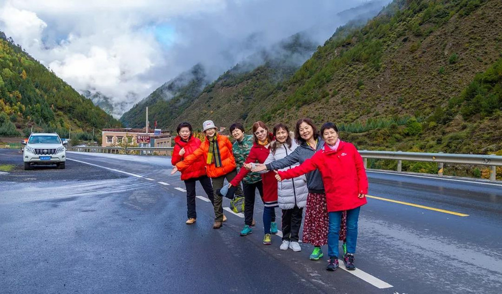 第二日晨起,酒店用完早餐之后再出发,沿着名声在外的318继续一路西行,原本需要翻越的第二座雪山名为高尔寺山,但因几年前的隧道通车,天堑变通途,让我们前行的道路变得容易了许多,虽然我常说:少走了弯路就会错过了风景,但为了各位同行的小伙伴能在车上用相机捕捉更多美景,我们找了一处藏家用山泉水冲刷掉第一天因为雨雪在汽车玻璃上留下的痕迹,闲来无事,在路边冒充徒搭去西藏的人,我想说的是,看到这一群五颜六色且花枝招展的小伙伴,你敢拉么?