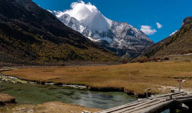 乘坐电瓶车到达洛绒牛场后,天气一如既往的好,在阳光的烘烤下,央迈勇身上的白雪被晒出蒸汽挂在山峰之巅,风拂面而过,也带走了刚刚腾起的云雾,像极了白色的头纱,很是美好。