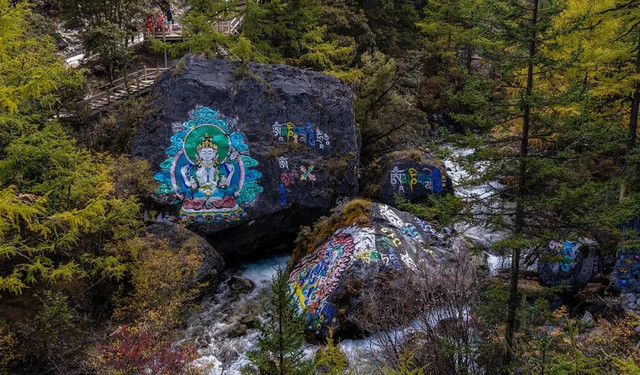 在去往塔公的路上,有一道别处绝无仅有的风景,你在靠近塔公的地方,道路两旁的任意一块石头上,都篆刻着菩萨像又或是藏传佛教的经文。