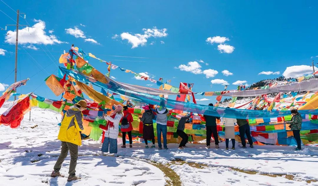 每次进入藏区,我们都会为 小伙伴准备一些有藏族特色的旅行小礼品,比如说五彩的经幡和隆达就是必备的,按照原计划,我们本来就应该在这里悬挂经幡和抛洒隆达,为自己和家人朋友祈福,结果人算不如天算,可能是老天因为我们前两天在亚丁的虔诚,特地为我们将这里装扮成了白色,而我们后续返回的高山道路两旁,也被妆点成了雪花营造的童话世界。
