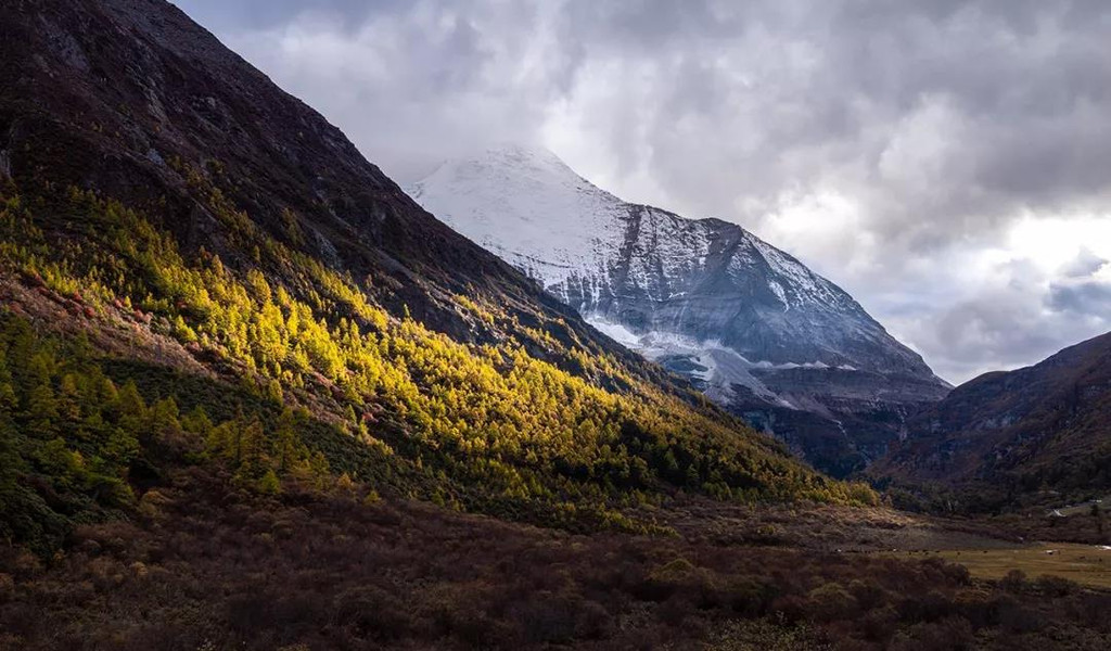 从折多山垭口沿途而下,又在被誉为“摄影家天堂”的新都桥畔,遇到了透过浓厚云层的一丝阳光,时处日落之际,原本已因为秋天被呈现黄色的草与树,又被斜阳镀上了一层金光。