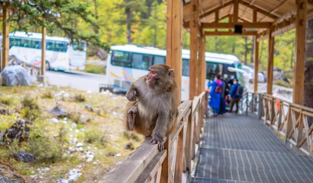 关于去往仙乃日路上很多讨食的松鼠、小鸟等,我已不想再赘述太多,因为随时来到这里都能见到这幅景象,而放单送行的猴哥,绝不是日常所见,游玩之后回到观光车处,它正百无聊奈的坐在这里,目送着每一个即将离开的小伙伴。