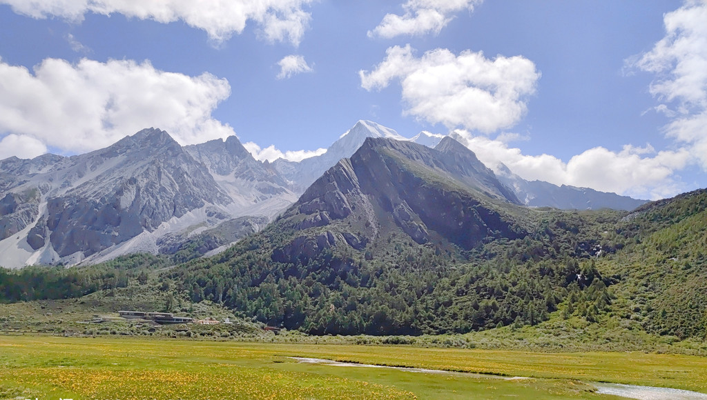 冲古草原。远处是央迈勇神山,从这里坐电瓶车1个小时到达洛绒牛场。(电瓶车一定要买往返票,步行路程太远了。)