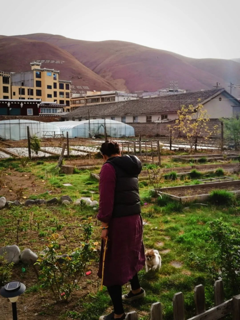 民宿老板是藏族,老板娘是汉族,在北京打拼了十来年后,17年回到道孚开了这家民宿,过上开门见雪山、背靠麦堆山、一猫一狗一田园的生活,清闲自居。