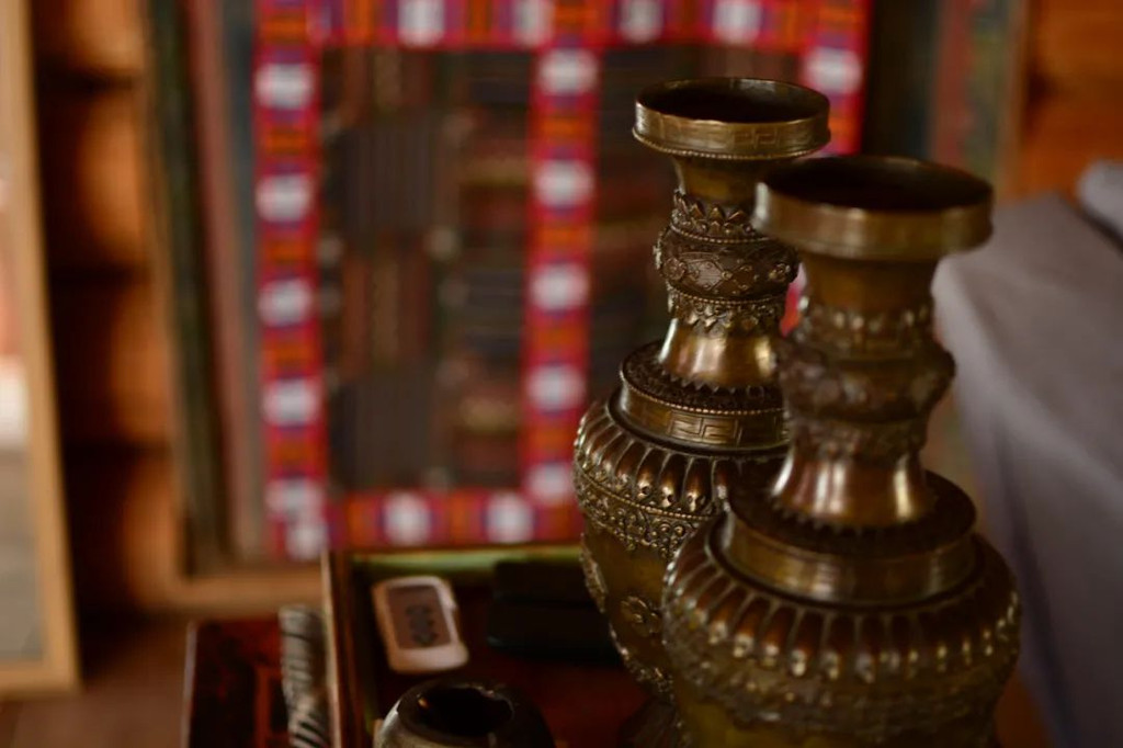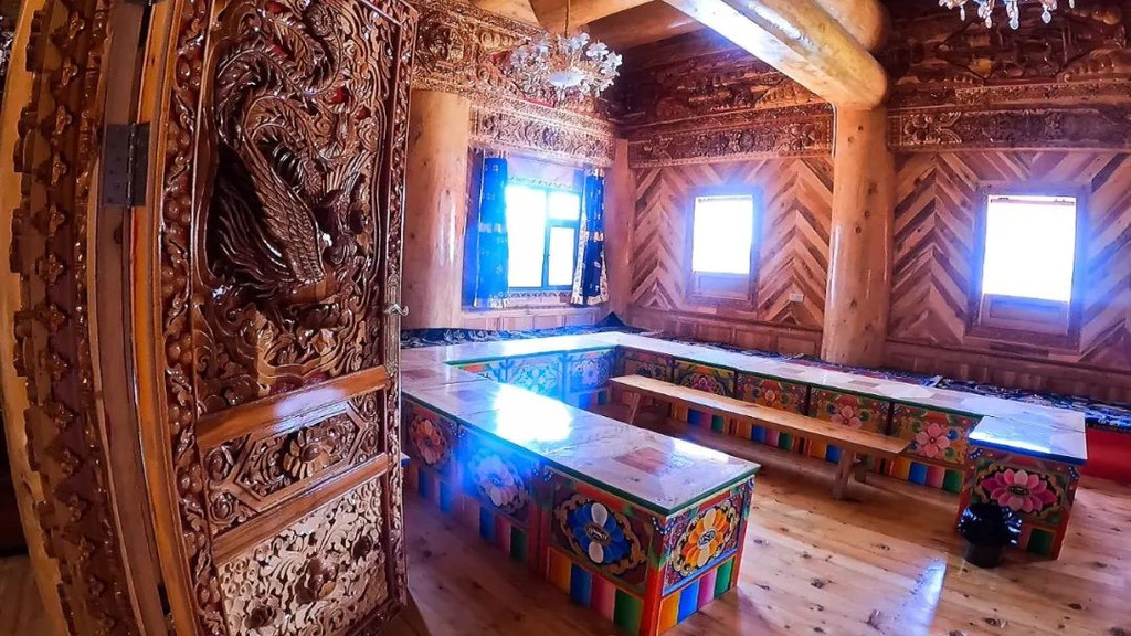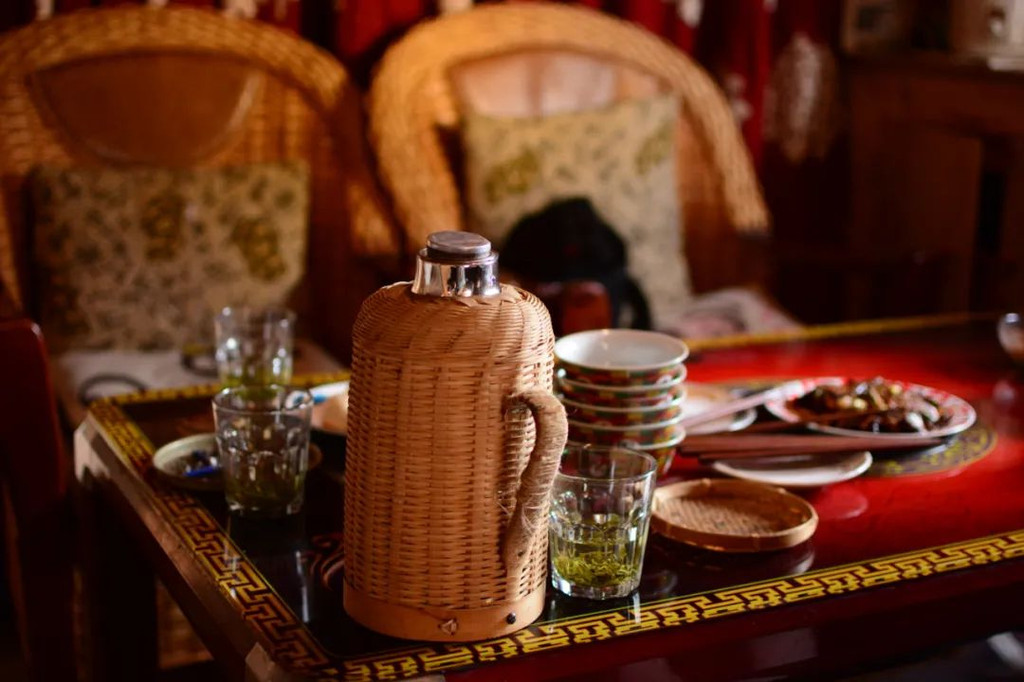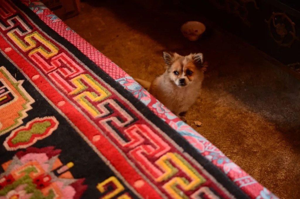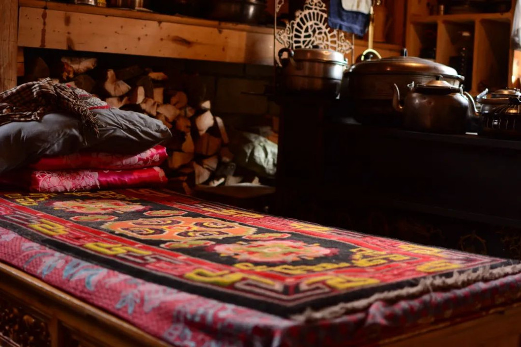 一张藏族特色的手工刺绣毛毯,一张纹边的方形桌,看到桌子自带的电磁炉,脑海里便浮现出烧个藏式火锅,咕嘟咕嘟和朋友聊天吃肉喝酒唱歌的画面。